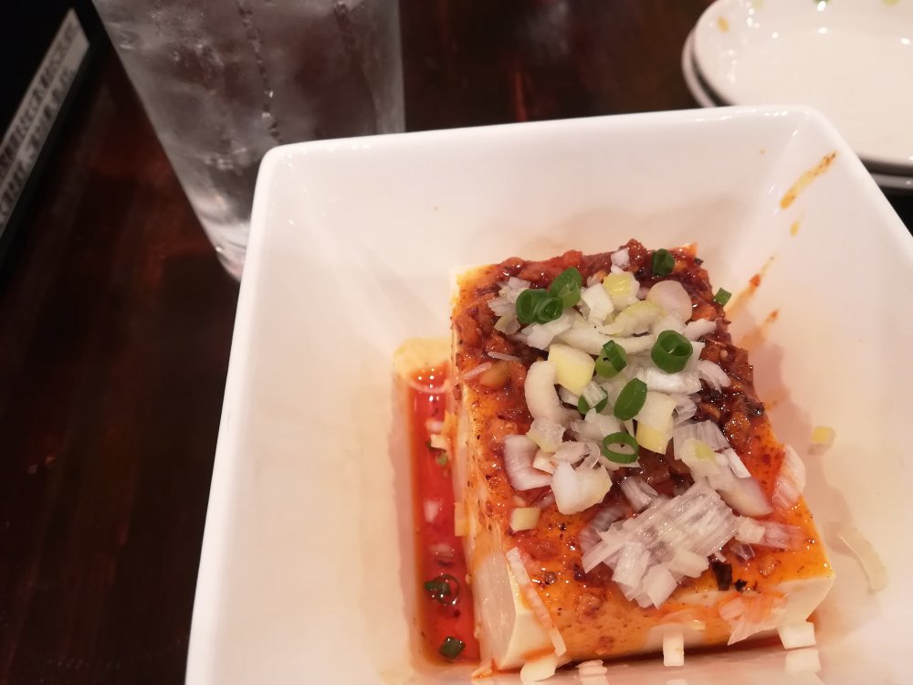 冷やっこの上にいっときはやった「食べるラー油」のようなものがかかった「ピリ辛豆腐」。