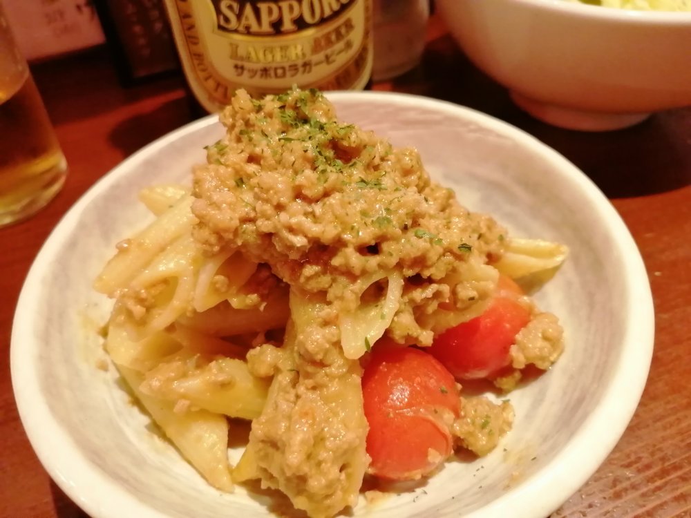 次にオーダーしたのは「坦々ペンネ」(530円)。坦々肉味噌がたっぷりとかかっており、ピリ辛ながらもクリーミーな味わいが特徴的。一見居酒屋の定番メニューとは異なりますが、意外なほど箸が進む一品です。のんきではこうした「少し意外性のある料理」にも出会えるのが楽しみのひとつです。