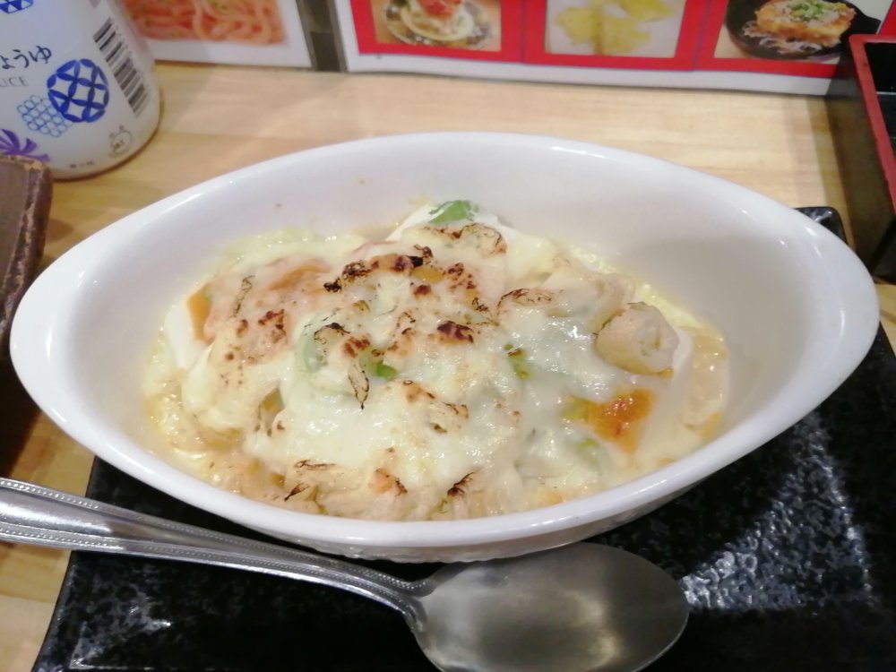次にいただいたのは、「豆腐ネギ味噌チーズ焼き」(280円)。熱々の豆腐に味噌とチーズが溶け合い、濃厚な風味が広がります。一口食べるたびにお酒をおかわりしたくなるほど、やみつきになる一品です。