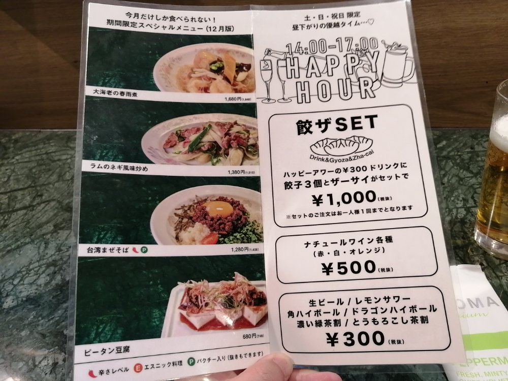 この日のお目当ては、土日祝限定の14:00~17:00に開催されるハッピーアワー。まずは、生ビール(ハッピーアワー価格300円)で乾杯!泡のきめ細やかさ、キレの良い喉越しに感動しながら、表参道でこの価格は破格だなと改めて思いました。