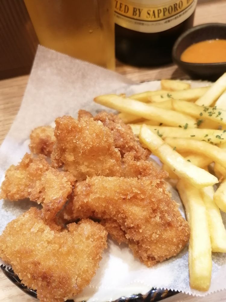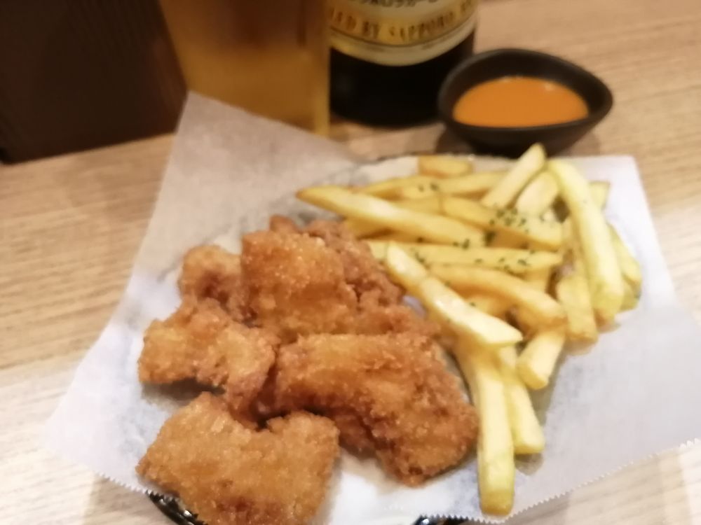 今日は「海老フェア」をやっているとのことで、ポップコーンシュリンプ&ポテトフライ(謎ソース付き)を頼んでみました。こちらが429円で、海老の香ばしさとポテトのカリッとした食感が絶妙にマッチ。謎のソースがまたアクセントとなり、どんどんお酒が進んでしまいます。