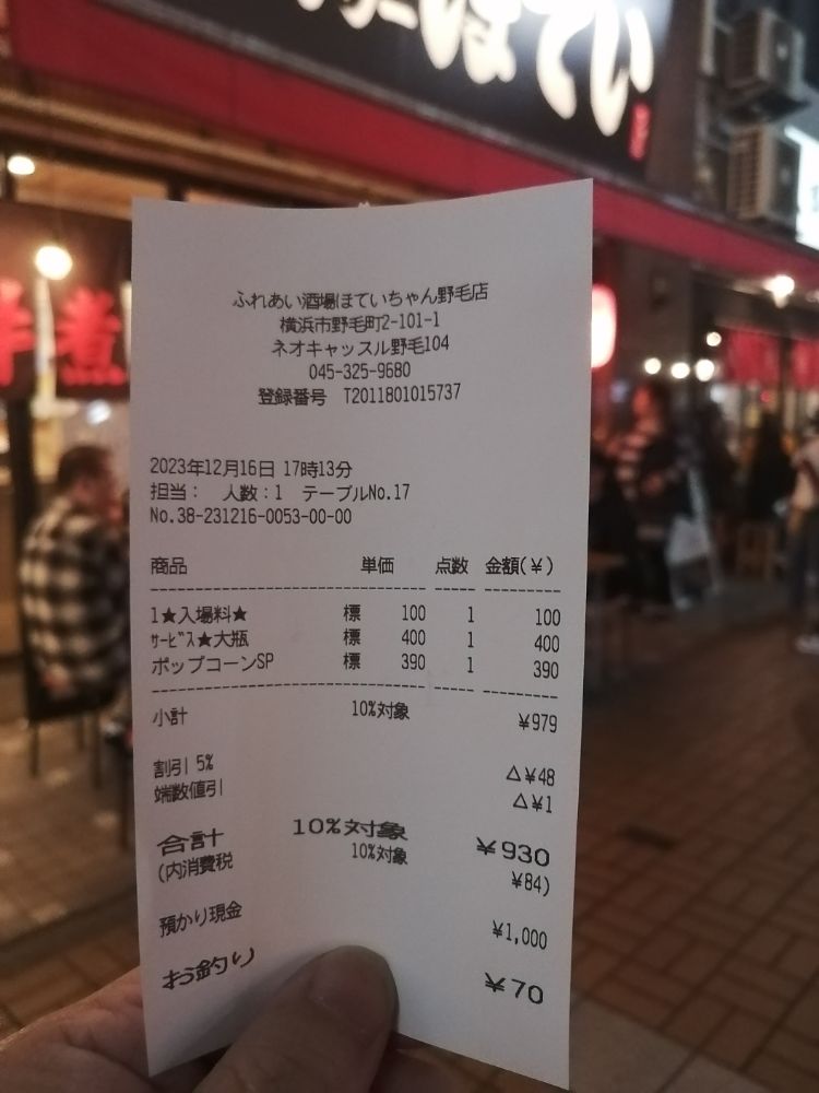 お酒とおつまみを堪能し、会計は合計930円。安さと美味しさを考えると、これほどコスパが良い場所はなかなかないのでは?ふれあい酒場 ほていちゃんは、立ち飲みカウンターでサクッと飲んで、気軽に楽しめる最高のスポットです。