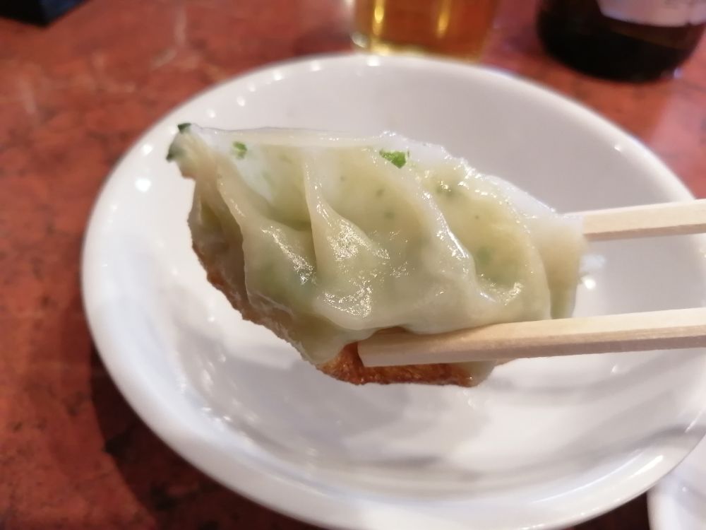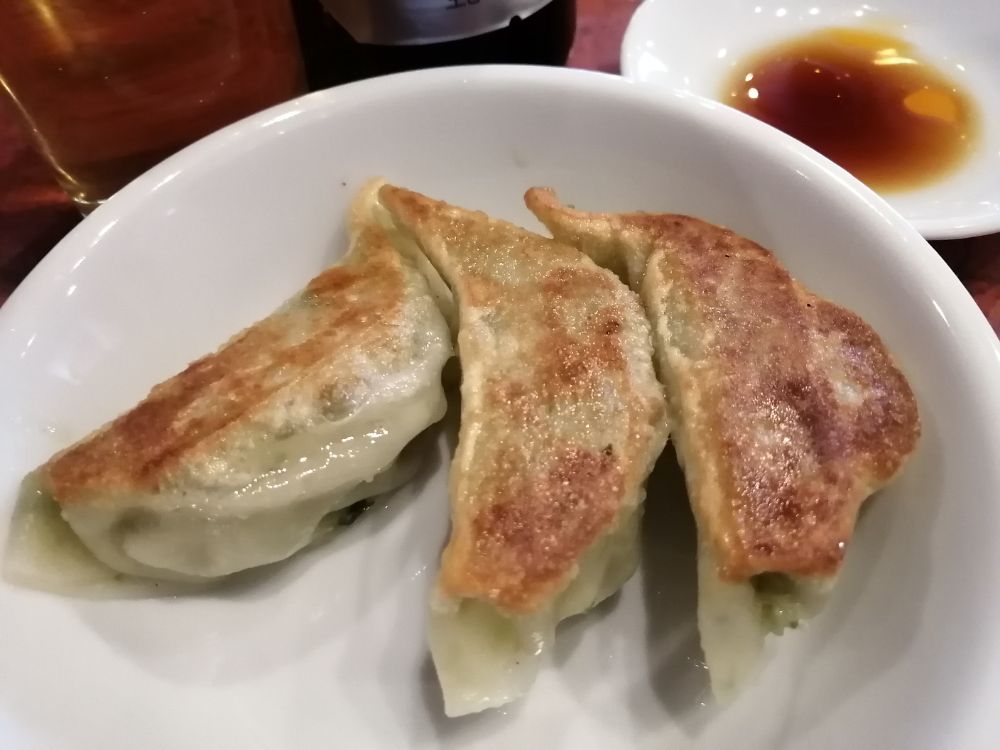 ビールのお供に頼んだのは「半ギョーザ」(330円)。3個という絶妙な量は、一人飲みにぴったりです。皮はパリッと、中はジューシー。噛むたびに肉汁と野菜の旨みが広がり、これがまたビールとよく合うんです。