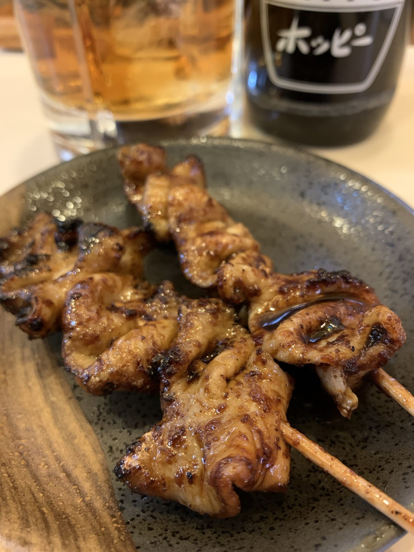 お通しのキムチともずくは、さっぱりした味付けでお酒の進む味。続いて注文したもつ焼き(シロ1本130円)とねぎま(タレ)は、どちらも炭火焼きならではの香ばしさがたっぷり。さらに、外はサクッと中はホクホクのごぼう唐揚げが登場。これがまた、ビールとの相性抜群!