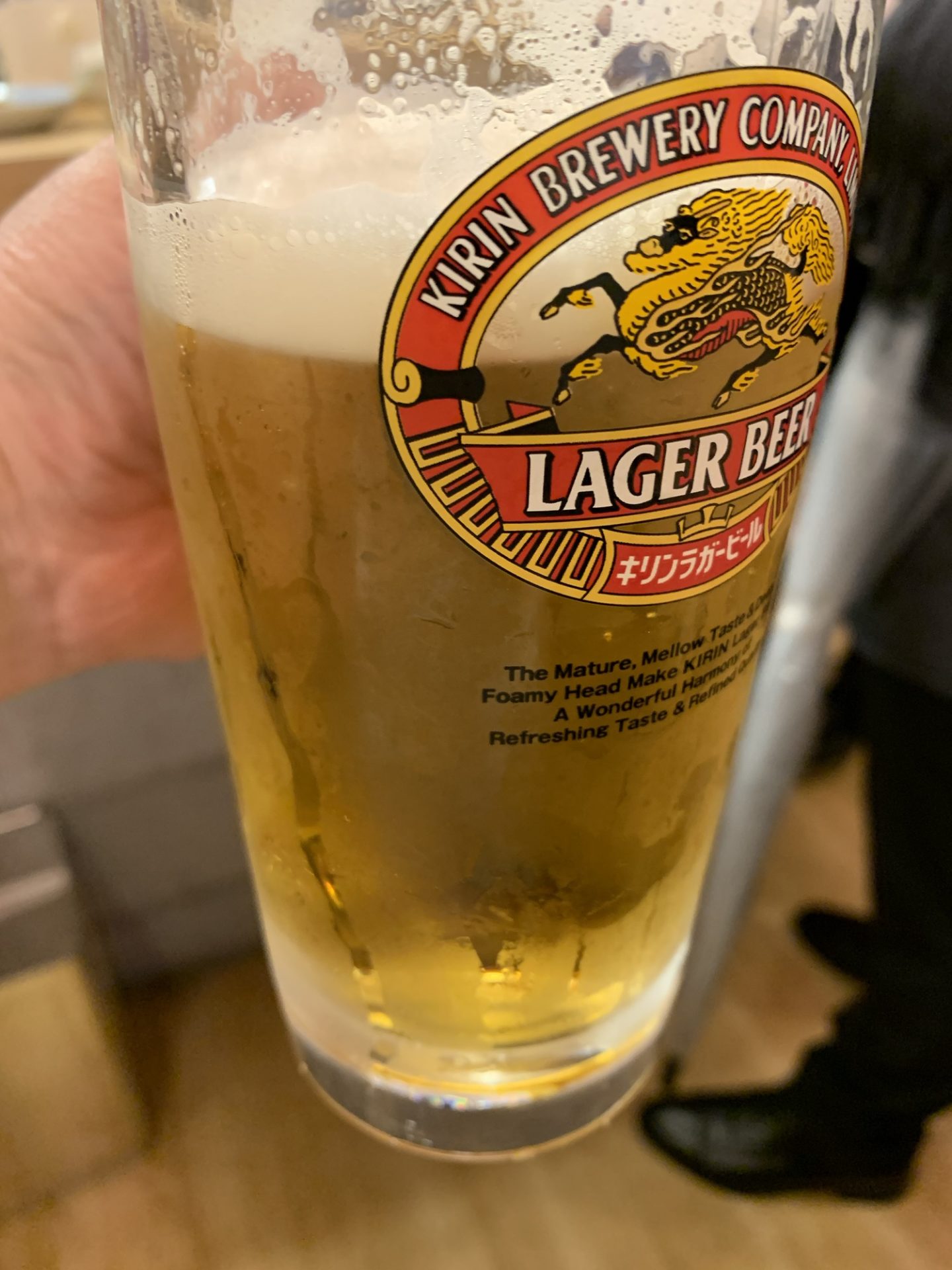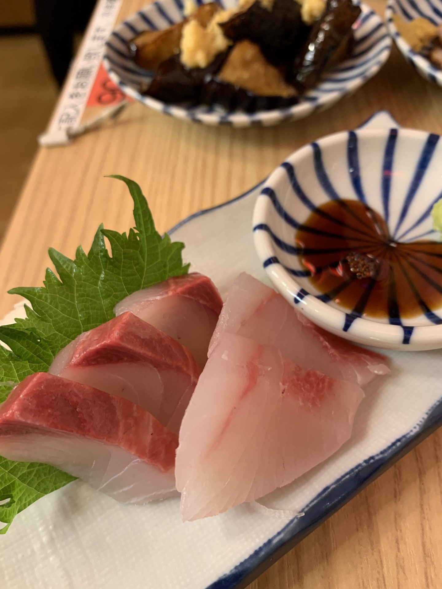 まずは生ビールを一杯。仕事後のこの一杯が、何よりも体に染み渡ります。お供に選んだのは「カンパチ刺身」。新鮮そのもの、厚切りのカンパチは弾力があり、口の中で旨味がじわりと広がります。
