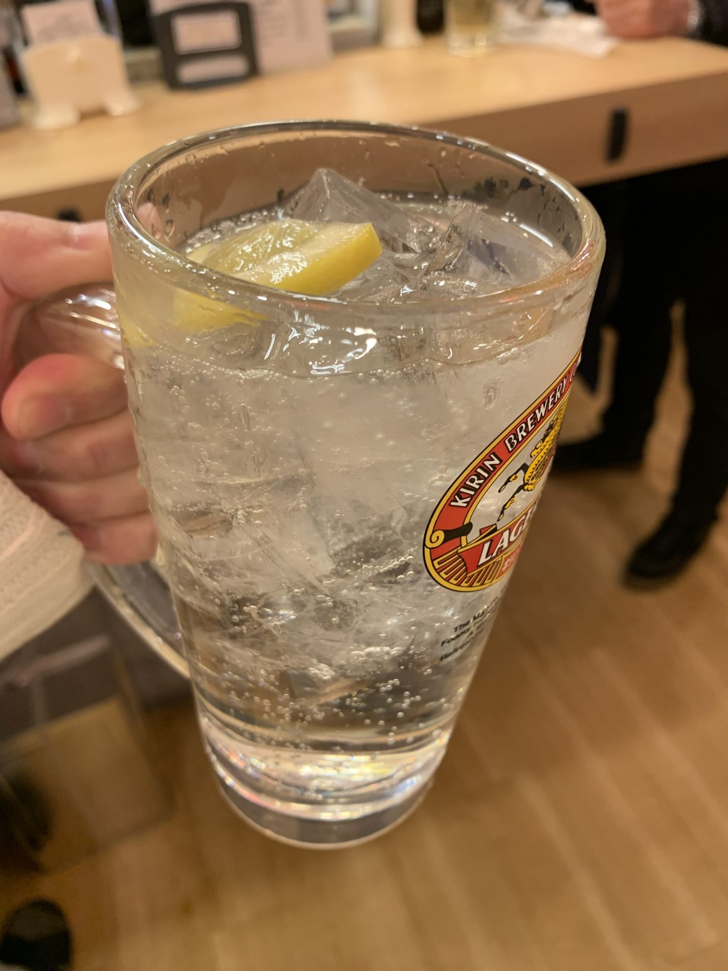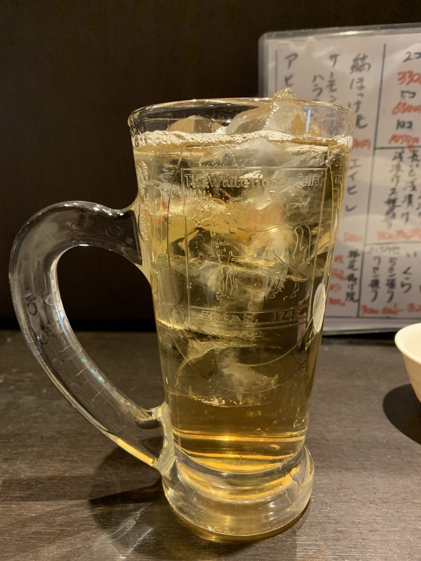 次に向かったのは、徒歩5分ほどの「どすこい四文屋」。こちらでは座席もあり、ゆっくり楽しめるのが嬉しいポイントです。乾杯はオリジナルハイボールでスタート。柑橘の香りがほんのり漂い、爽やかな飲み口が癖になります。