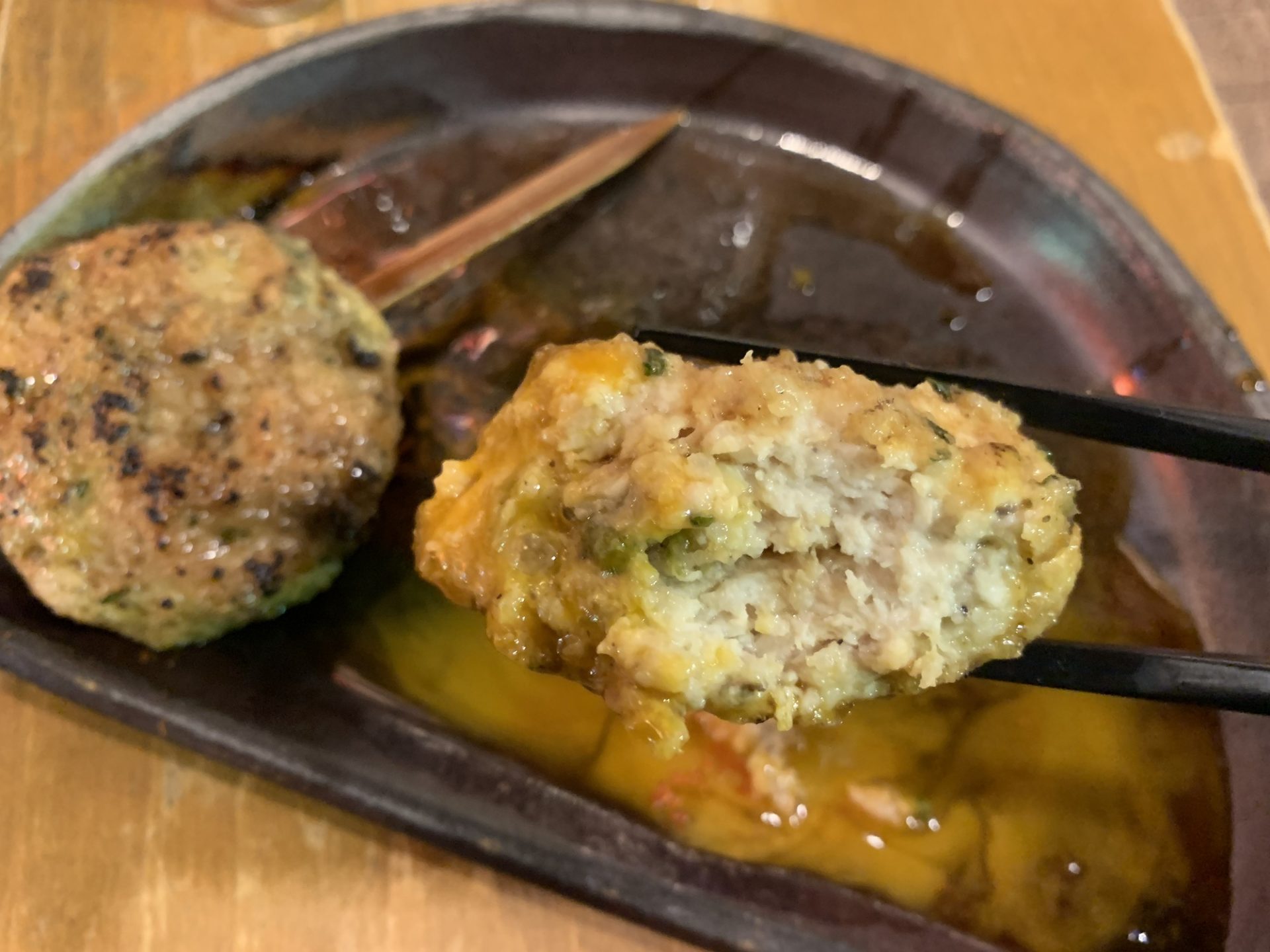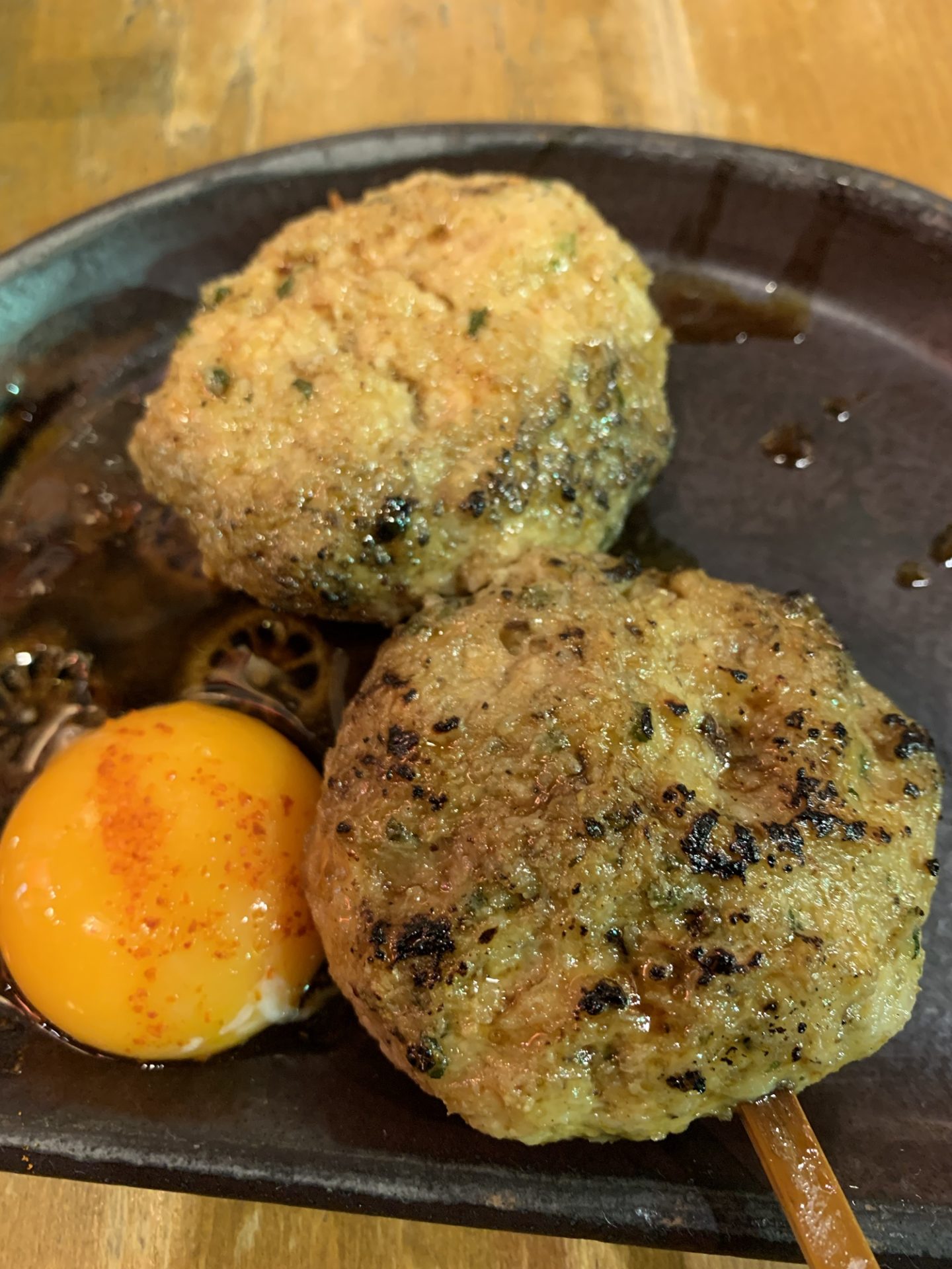 ビールを一杯楽しんだ後は、ちょっとボリュームがあるおつまみを。ここでおすすめしたいのが「金運つくね」です。ハンバーグのようなジューシーなつくねが、串に二個刺さって提供されます。炭火でじっくり焼かれており、表面の焦げ目が香ばしく、タレが絶妙に絡んでおいしさ倍増。さらに、卵の黄身がトッピングされていて、食べるたびに金運がアップしそうな気分になります。たった165円でこのクオリティは、もう頼まずにはいられません。
