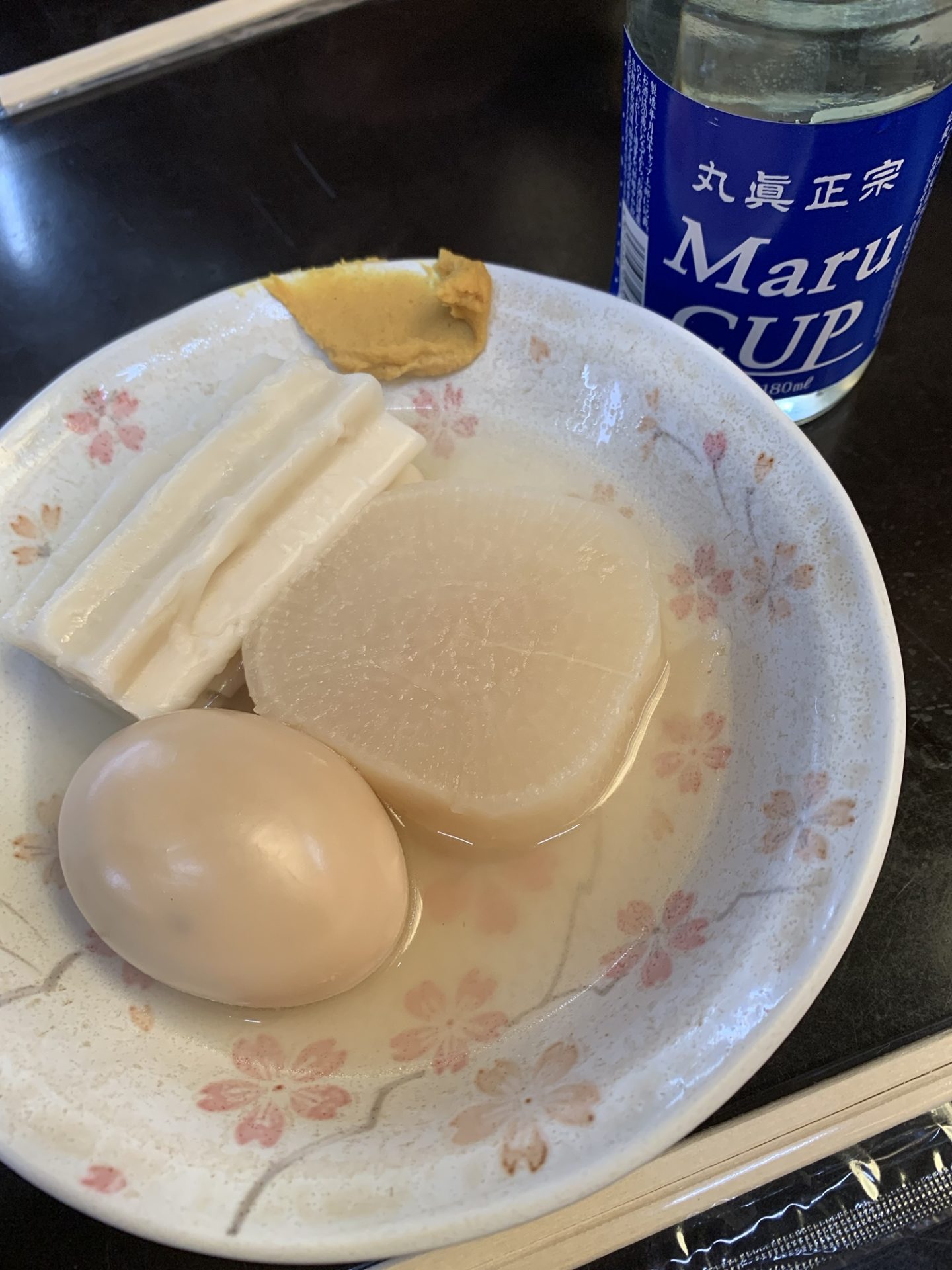 再びお酒に戻り、マルカップをぐいっと流し込む頃、次に登場するのが「たまご」。黄身の部分までしっかりと出汁が染み込んでいて、ほのかな甘みとコクが感じられます。七味を軽く振りかけて味変を楽しむのもおすすめ。