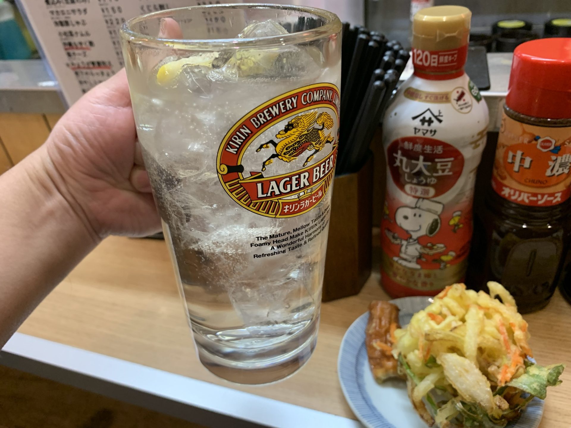 2杯目はチュウハイにチェンジ。生ビールとはまた違う、さっぱりとした喉越しが心地よく、脂っぽいおつまみの後でもすいすい飲める一杯です。価格もリーズナブルで、手軽に楽しめるのが嬉しいポイント。