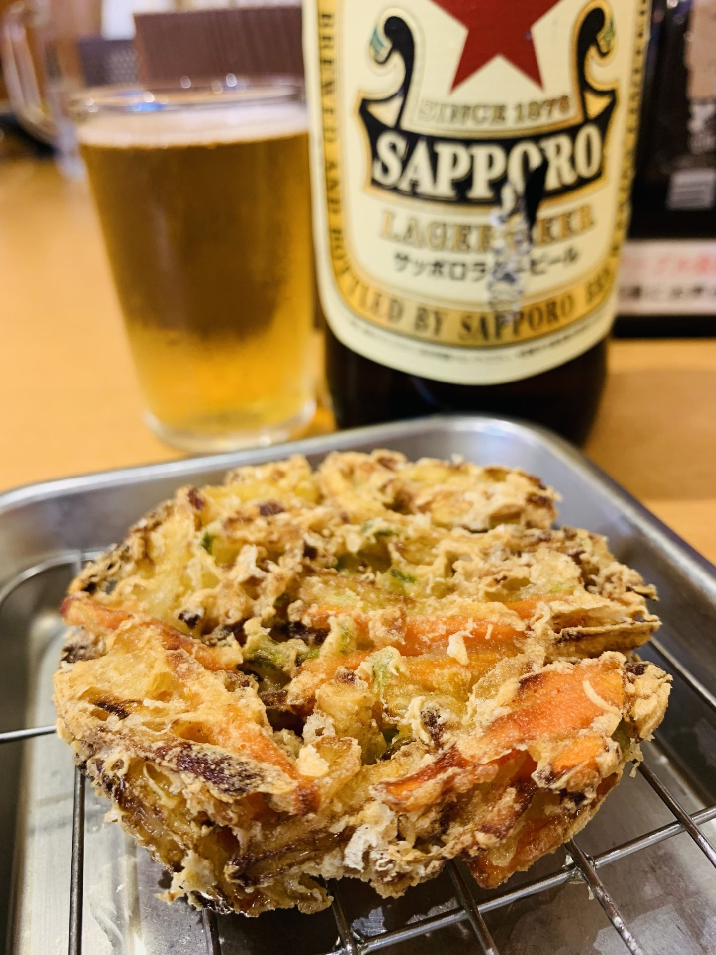 おつまみには、野菜かき揚げをチョイス。驚くべきはその大きさで、そば屋さんで提供されるものよりもボリュームがあります。サクサクとした食感と、野菜の甘みが口いっぱいに広がり、ビールとの相性も抜群です。