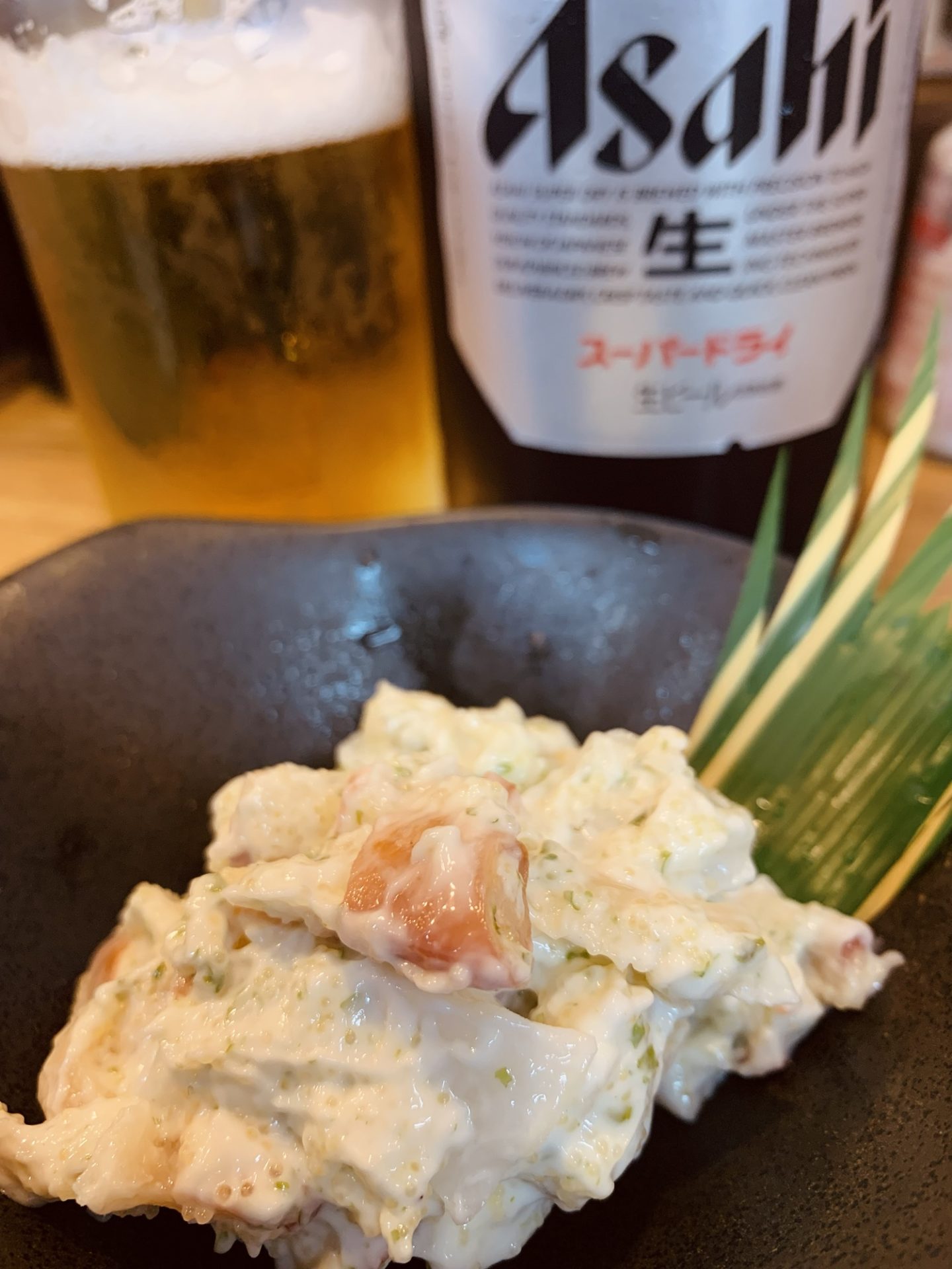 おつまみには、ホッキ貝サラダをチョイス。新鮮なホッキ貝のコリコリとした食感と、マヨネーズのまろやかさが絶妙にマッチしています。さっぱりとした味わいで、ビールとの相性も抜群です。
