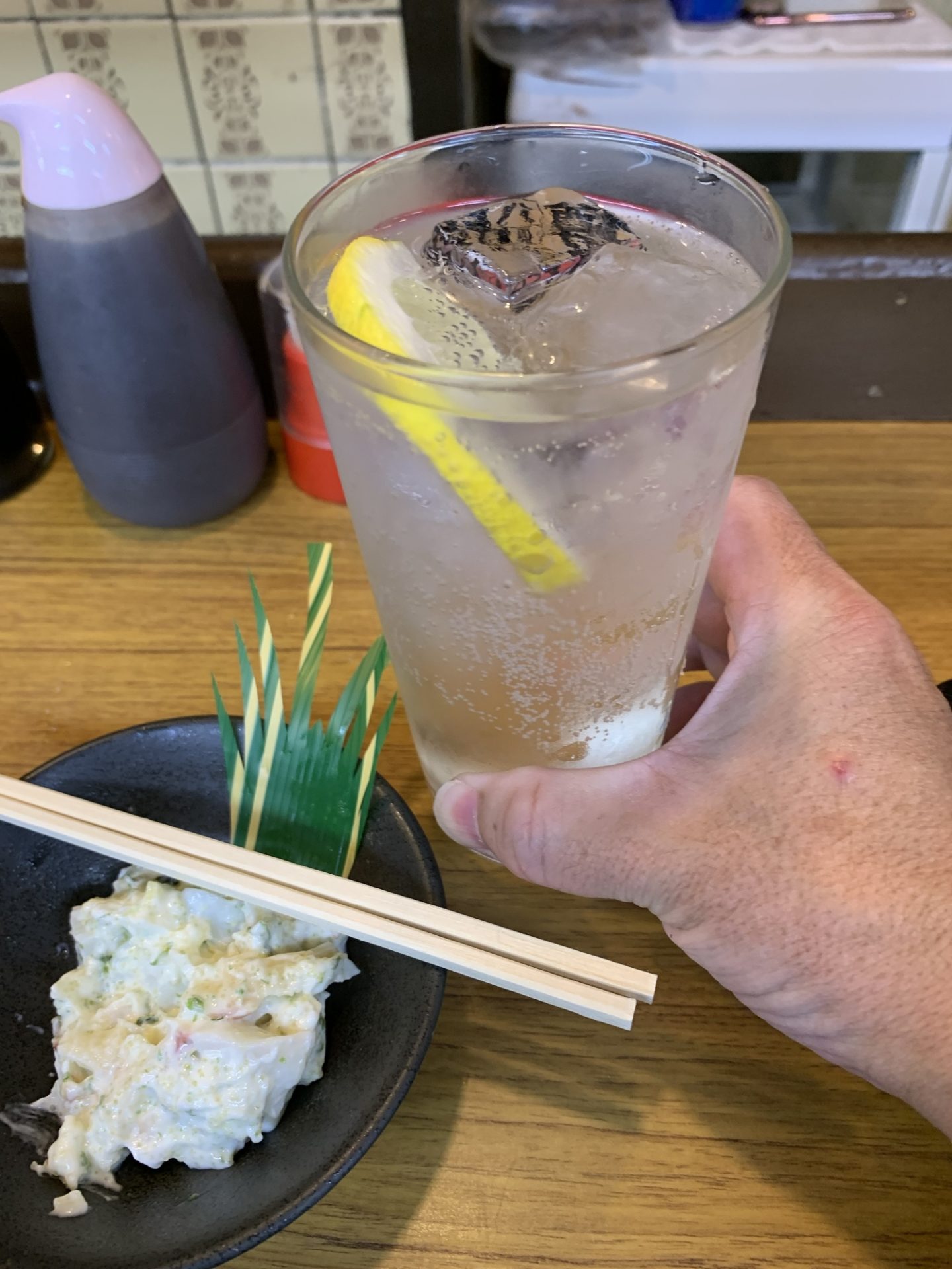 次に、酎ハイを注文。こちらの酎ハイは焼酎がしっかりと効いており、飲みごたえがあります。爽やかな風味が口の中に広がり、リフレッシュできます。