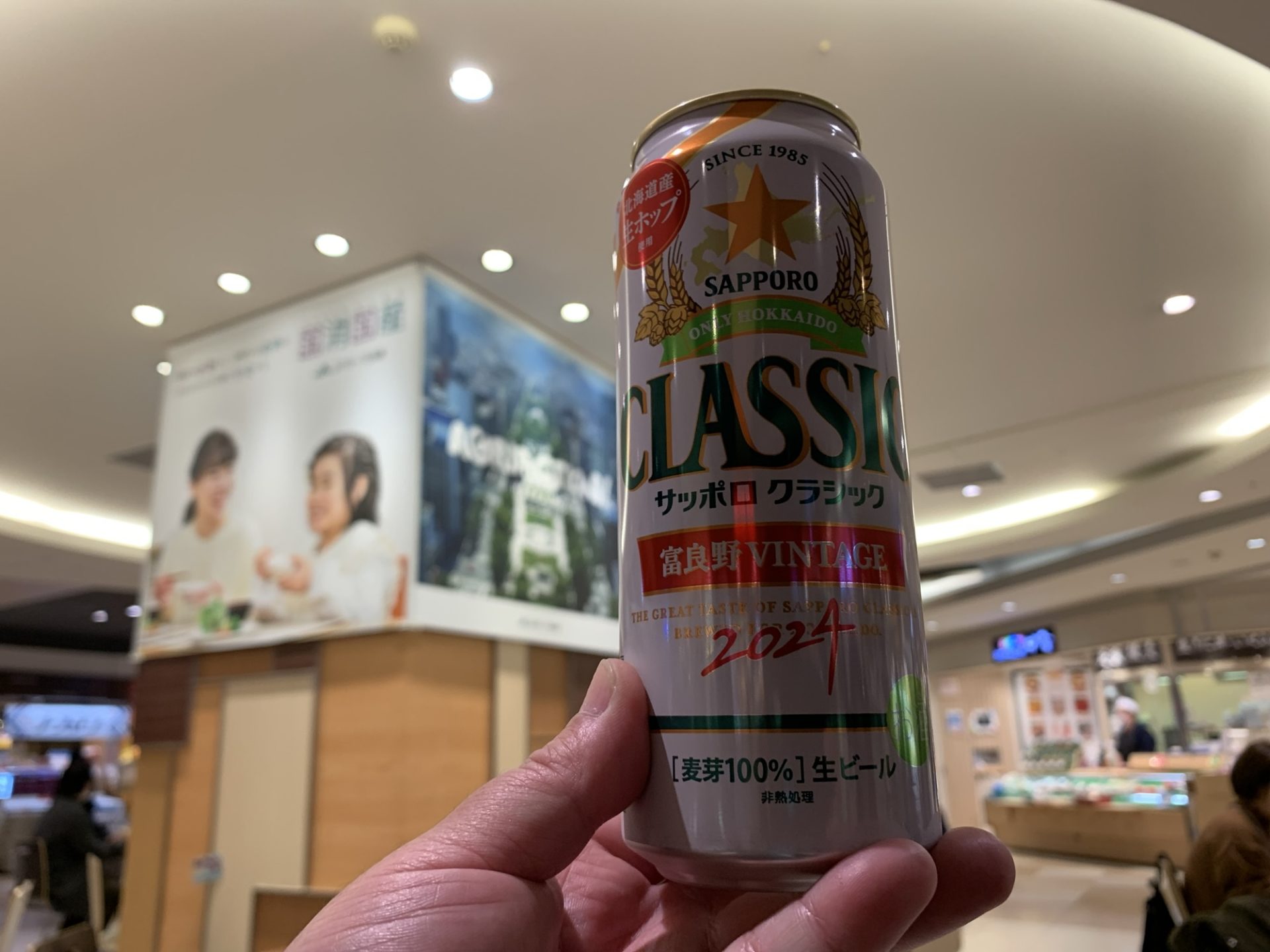 旅の締めくくりに、新千歳空港内の「北海道本舗」でサッポロクラシック富良野ビンテージを手に入れました。北海道限定のこのビールは、富良野産ホップを生のまま使用し、収穫したての香りと爽やかな味わいが特徴です。空港内のベンチで缶をプシュッと開けると、ホップの豊かな香りが広がり、口に含むと爽やかな苦味とコクが感じられます。まさに旅の疲れを癒す一杯です。