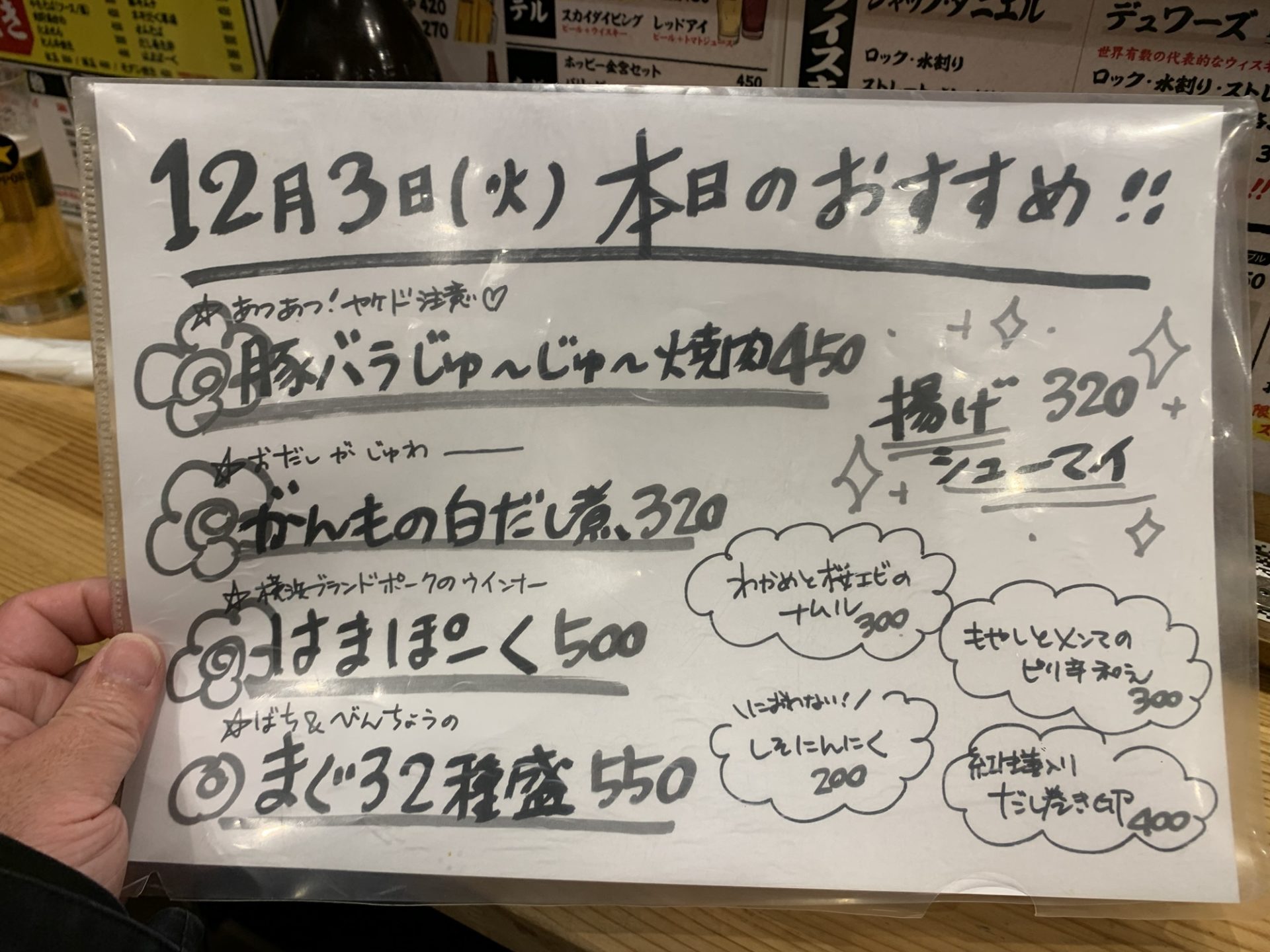 関内駅直結の「国民酒場 じぃえんとるまん 関内マリナード店」は、リーズナブルな価格と美味しい料理が魅力の立ち飲み居酒屋です。サッポロ赤星の大瓶が430円で楽しめるのは驚きで、ポテトフライやはまぽーくなどのおつまみも絶品でした。明るい雰囲気の店内で楽しいひとときを過ごすことができました。立ち飲み初心者から常連さんまで、誰もが気軽に立ち寄れるお店としておすすめです。