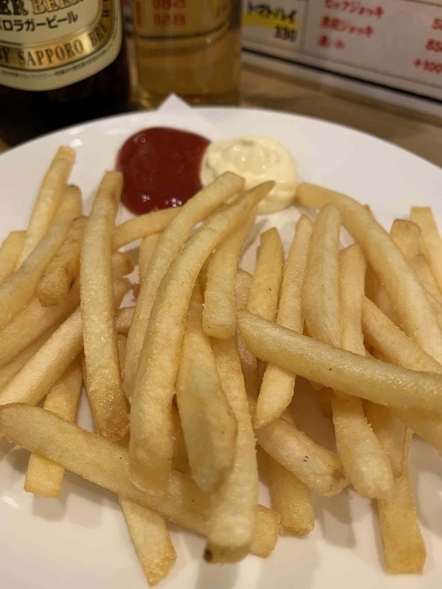 次に注文したのは、定番「ポテトフライ」。300円というリーズナブルな価格にも関わらず、ボリュームたっぷり。外はカリッと、中はホクホクで、塩加減も絶妙です。ビールとの相性も抜群で、ついつい手が伸びてしまいます。