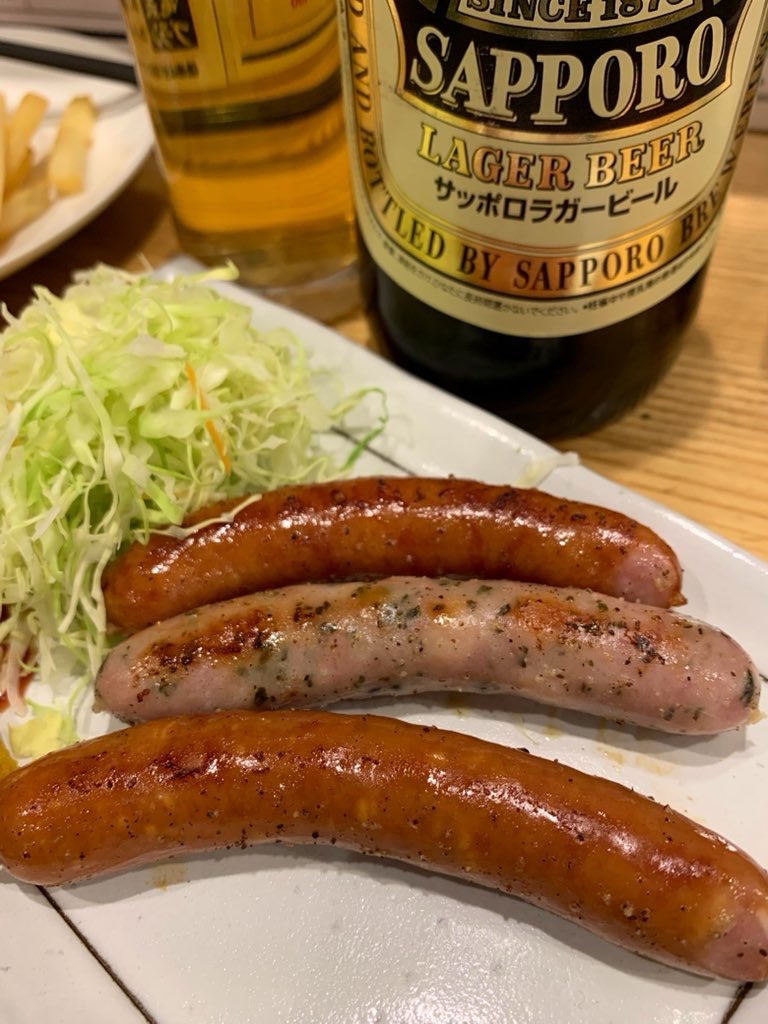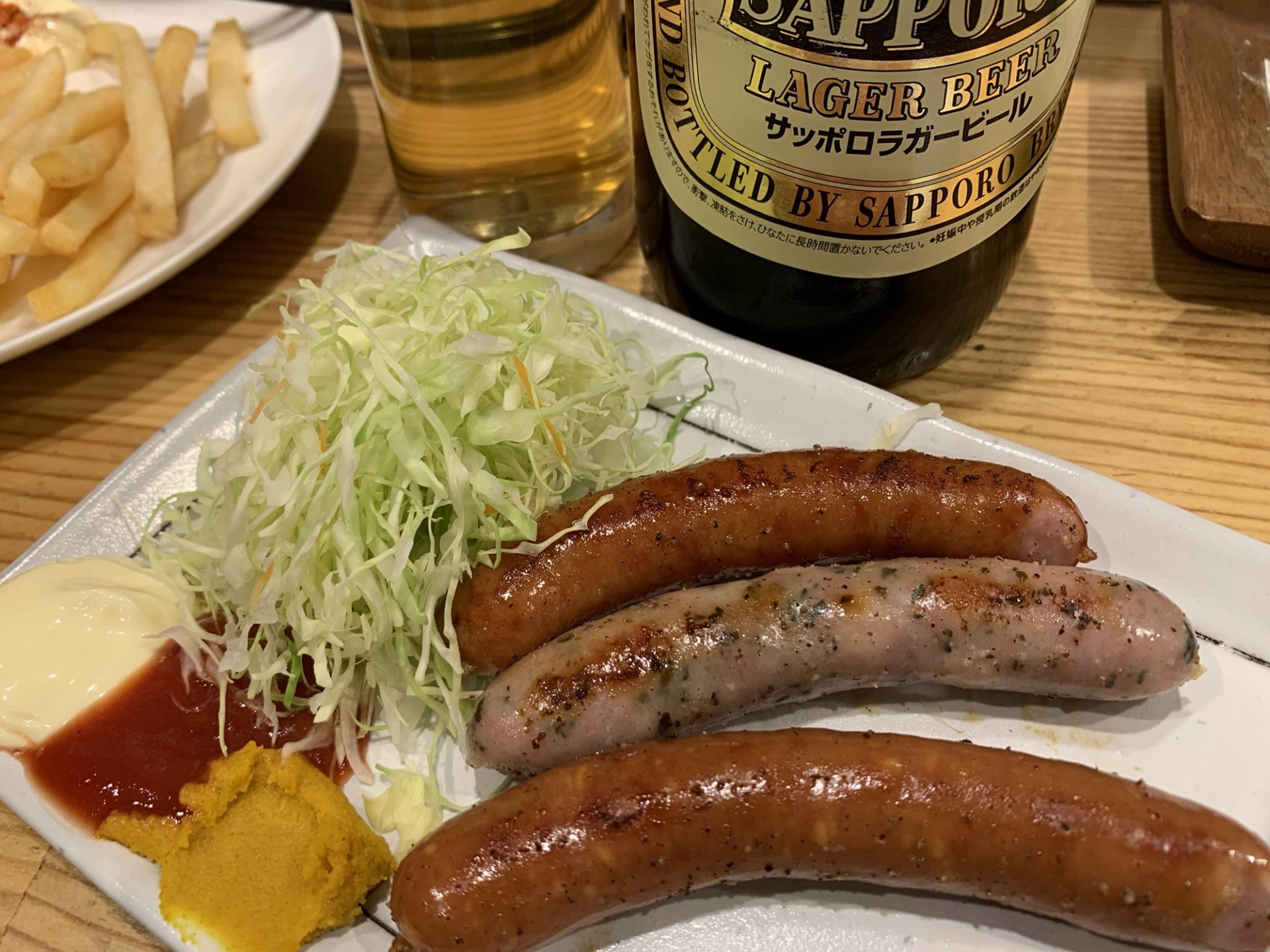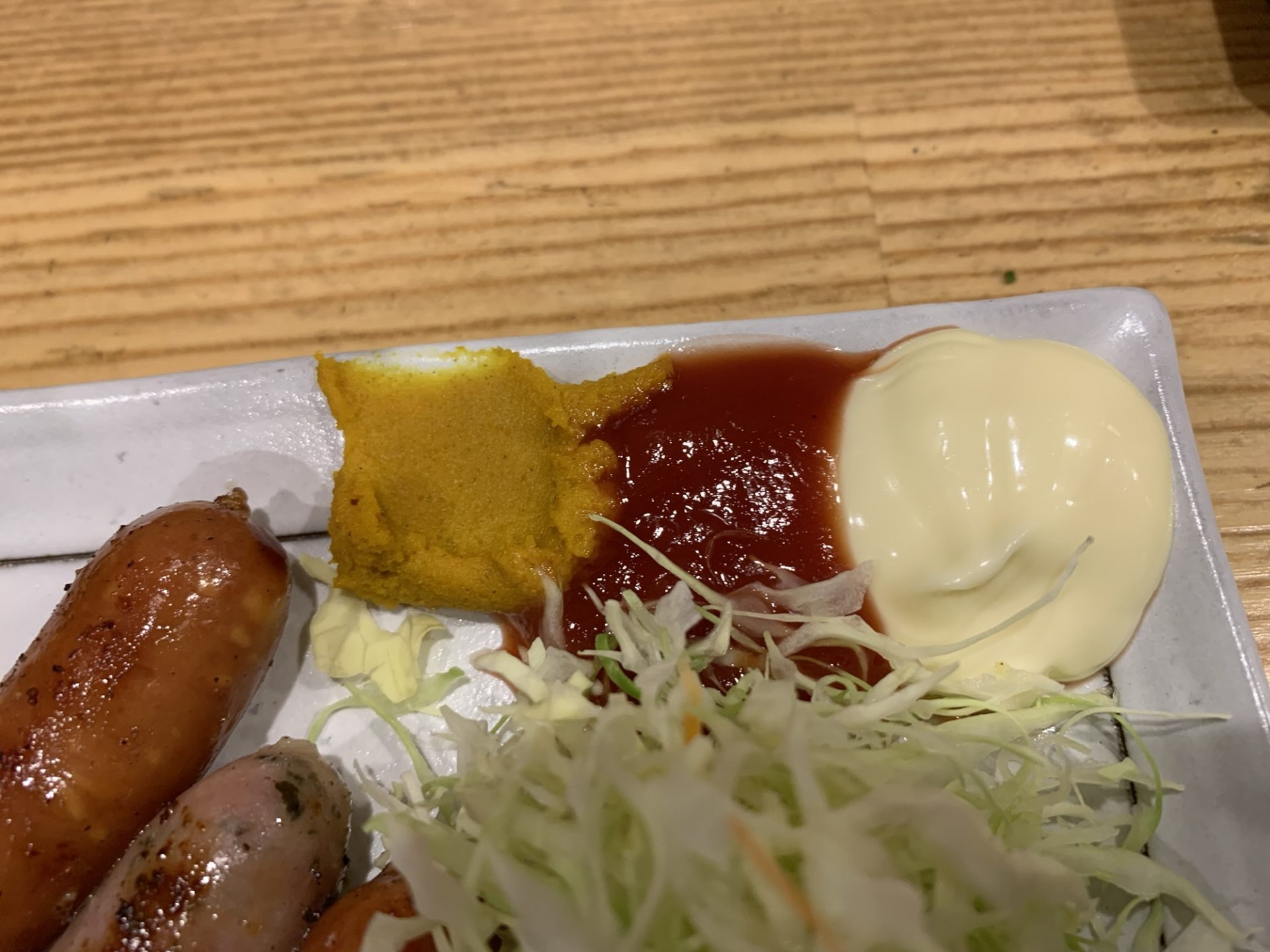 続いて、横浜ブランドのポーク「はまぽーく」のウインナー3種盛りを注文。3種類の味が楽しめ、マヨ、ケチャ、カラシが添えられています。プリッとした食感とジューシーな味わいが口いっぱいに広がります。これまたビールが進む一品です。