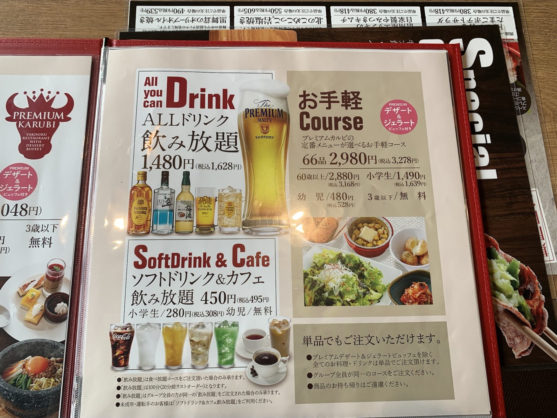 休日の昼下がりに訪れたプレミアムカルビ 宮前平店。まずは生ビールで乾杯し、食べ放題のプレミアムコース(100分、税込4,048円)をスタートしました。このコースでは、105品ものメニューが楽しめ、デザートビュッフェも付いています。