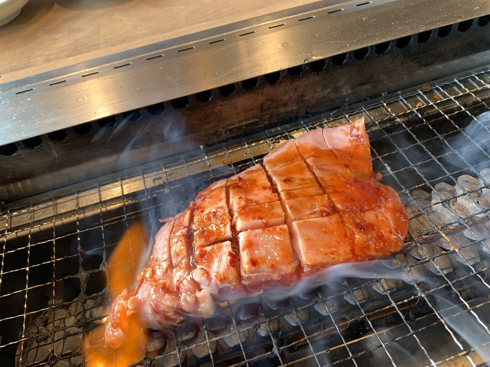 さっぱりとした味わいを求めて「炙り塩タン」を注文。薄切りのタンは、炙ることで程よい歯ごたえと香ばしさが生まれ、レモンを絞っていただくと爽やかな風味が広がります。