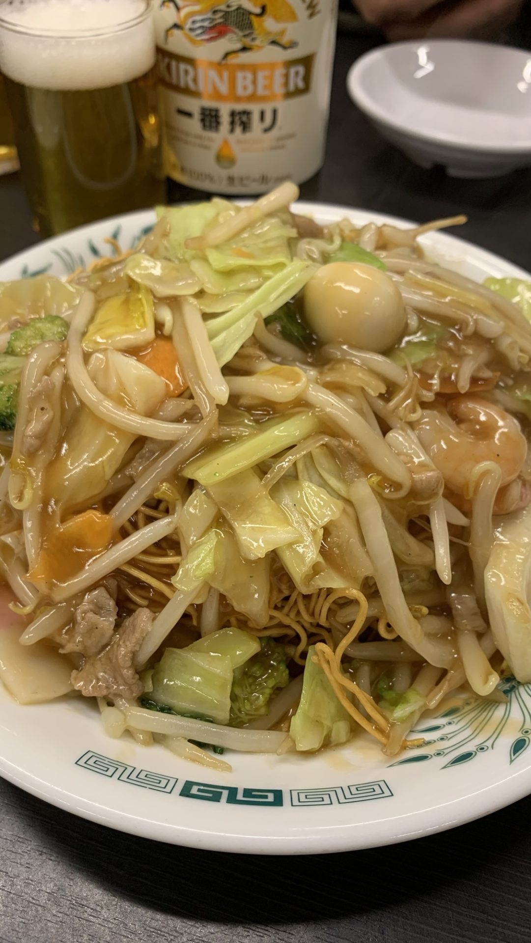 パリパリとした食感の揚げ麺の上に、たっぷりの野菜と豚肉、うずらの卵が乗ったあんかけがかかっています。あんはとろみがあり、野菜の旨味と豚肉のコクが絶妙に絡み合っています。揚げ麺の香ばしさとあんのまろやかさが口の中で一体となり、箸が止まらなくなる美味しさです。まさに〆にふさわしい一品。