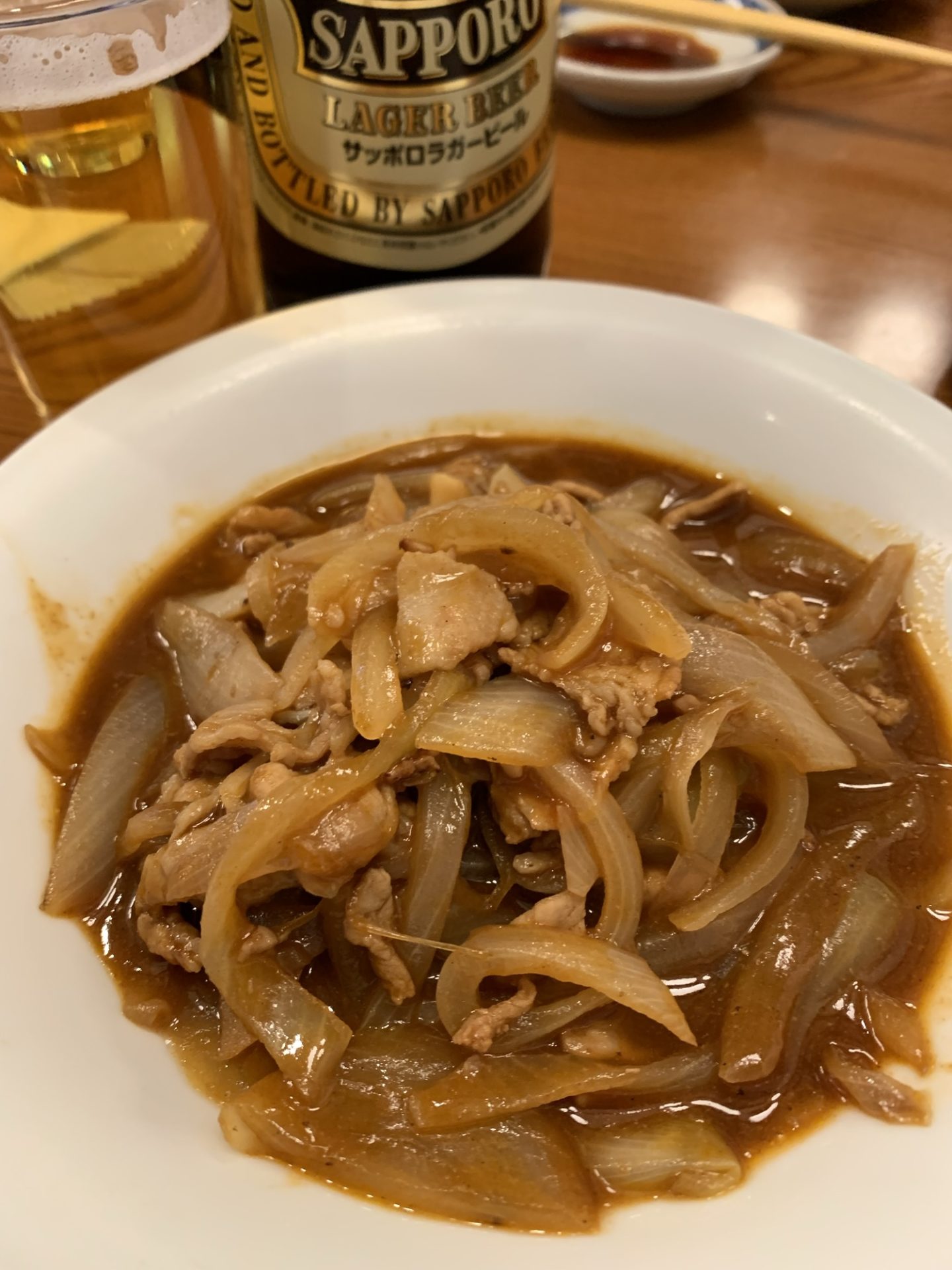 水口特製のいり豚は、豚肉と玉ねぎをオリジナルソースで炒めた一品。デミグラスソースのような洋風の味付けで、ご飯が進むこと間違いなし。定食としても人気のメニューです。