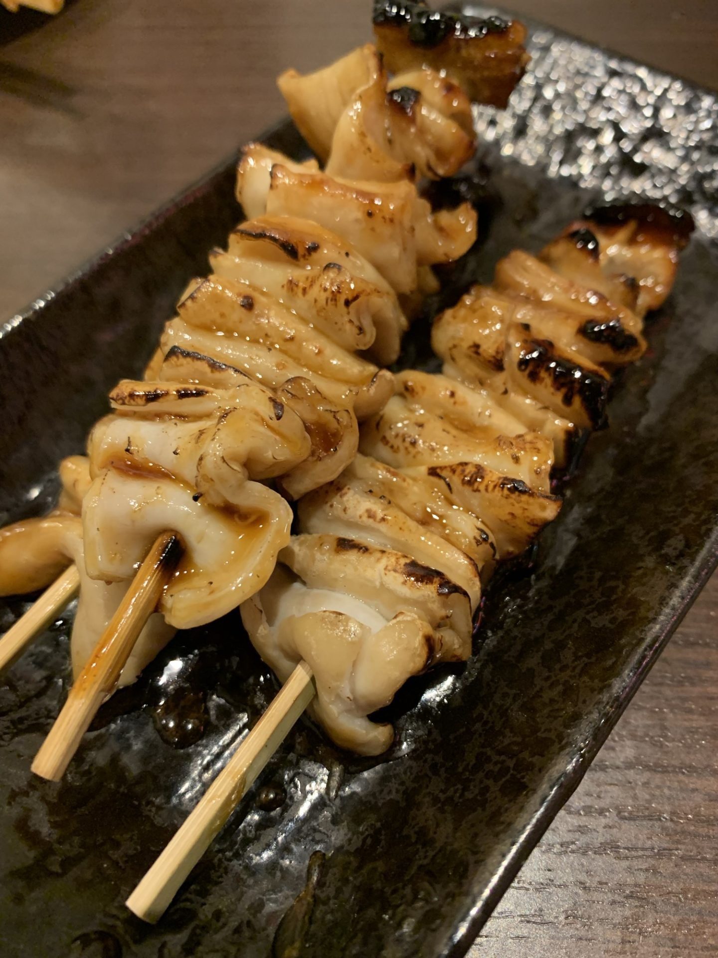 続いて、串焼きのシロをいただきます。たれがしっかりと染み込んだシロは、噛むほどに旨味が広がり、クセになる味わい。程よい弾力があり、食感も楽しめます。こちらもハイボールとの相性が良く、ついついお酒が進んでしまいます。