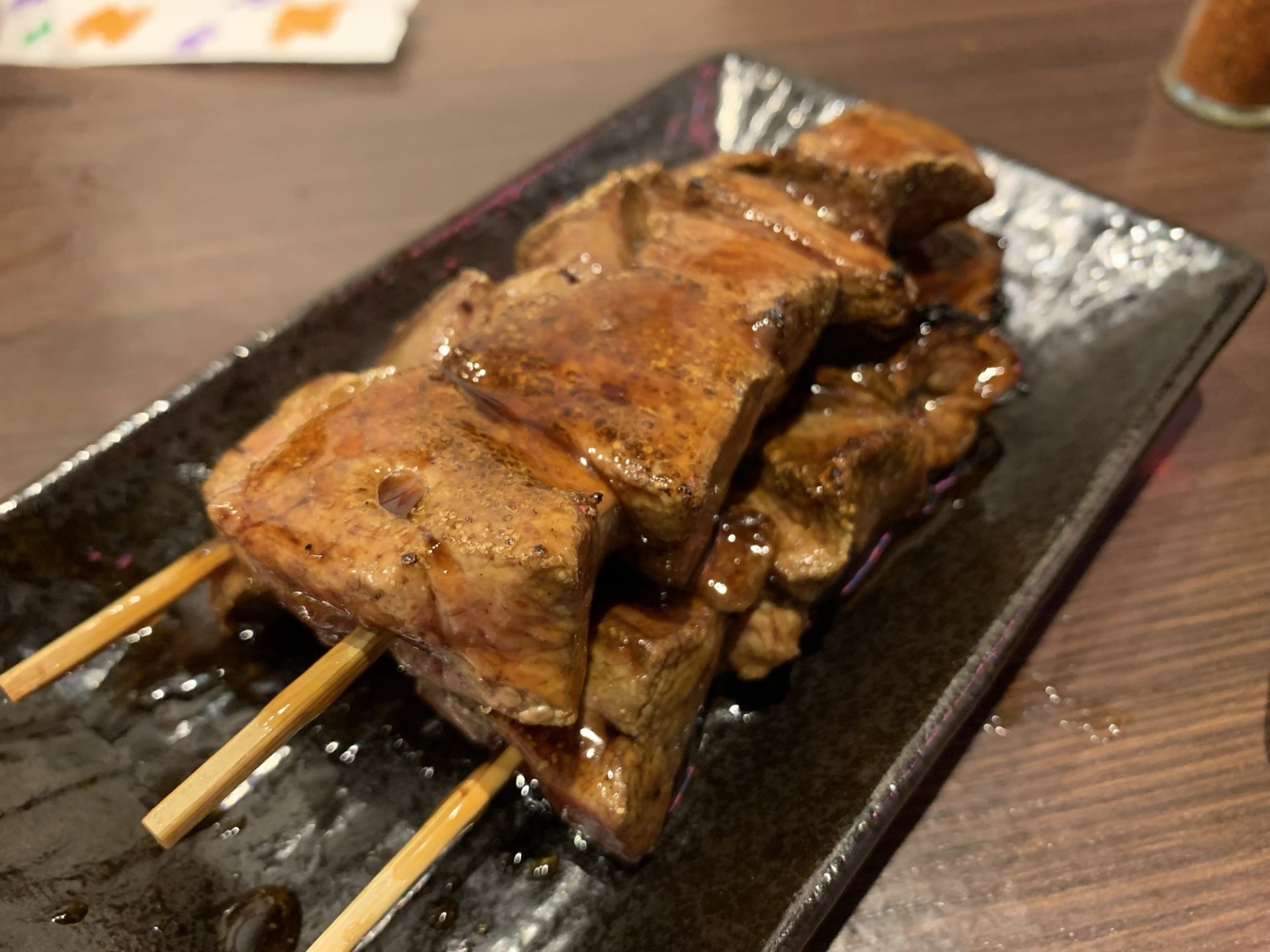 次に注文したのは、串焼きのレバ。たれがしっかりと絡んだレバーは、程よい焼き加減で、外は香ばしく中はジューシー。臭みもなく、レバー本来の旨味が感じられます。ビールとの相性も抜群で、思わずもう一本と手が伸びてしまいそう。