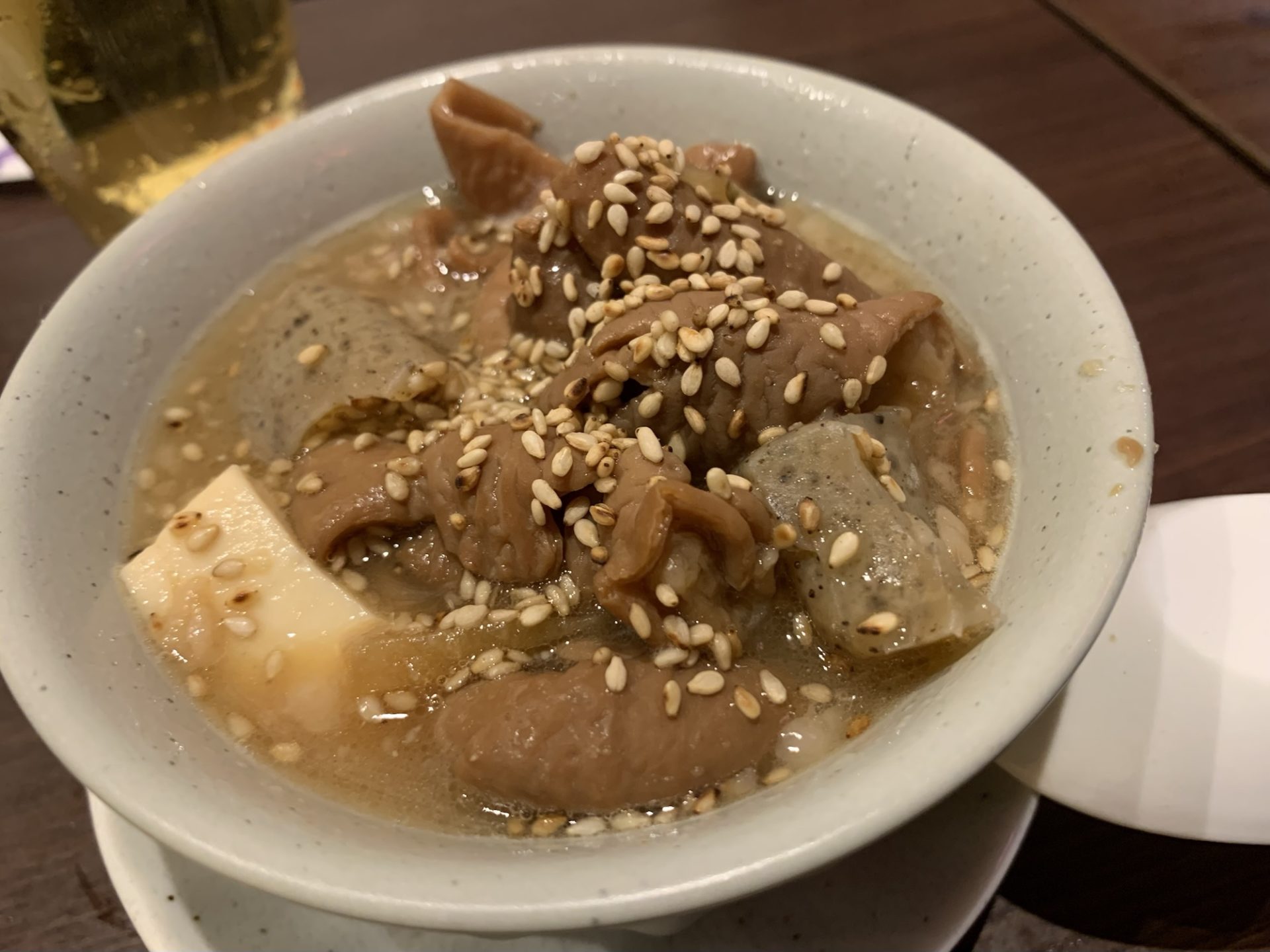 お店の名物でもある、もつ煮込みを注文。じっくりと煮込まれたもつは、柔らかくてとろけるような食感。味噌ベースのスープは、コクがありながらもあっさりとしていて、飲み干したくなる美味しさ。寒い日には特におすすめの一品です。