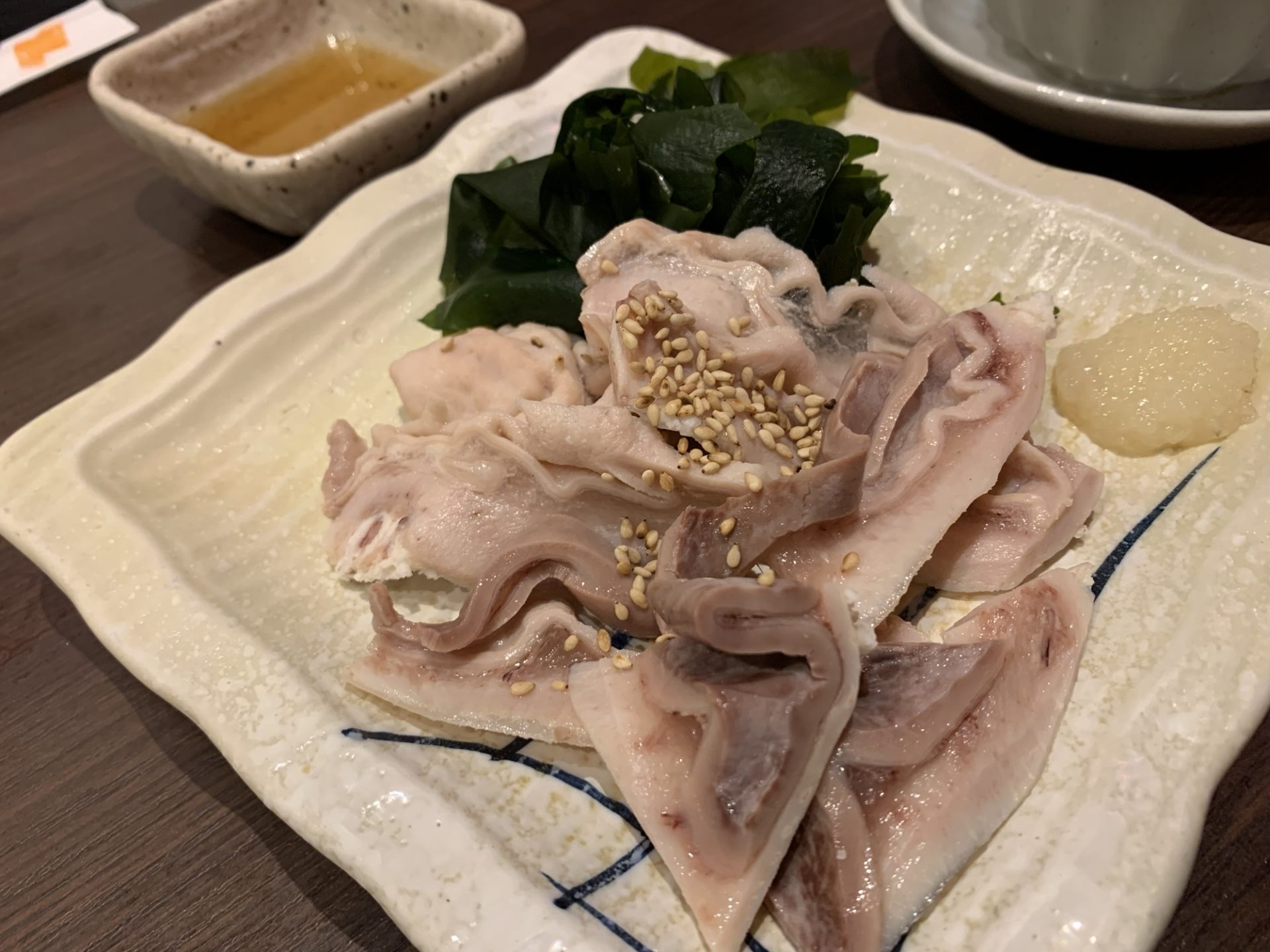 最後に、ガツポン酢をいただきます。コリコリとした食感のガツに、さっぱりとしたポン酢がよく合います。ワカメやゴマがトッピングされており、口の中をリフレッシュしてくれる一品。脂っこい料理の後にぴったりです。