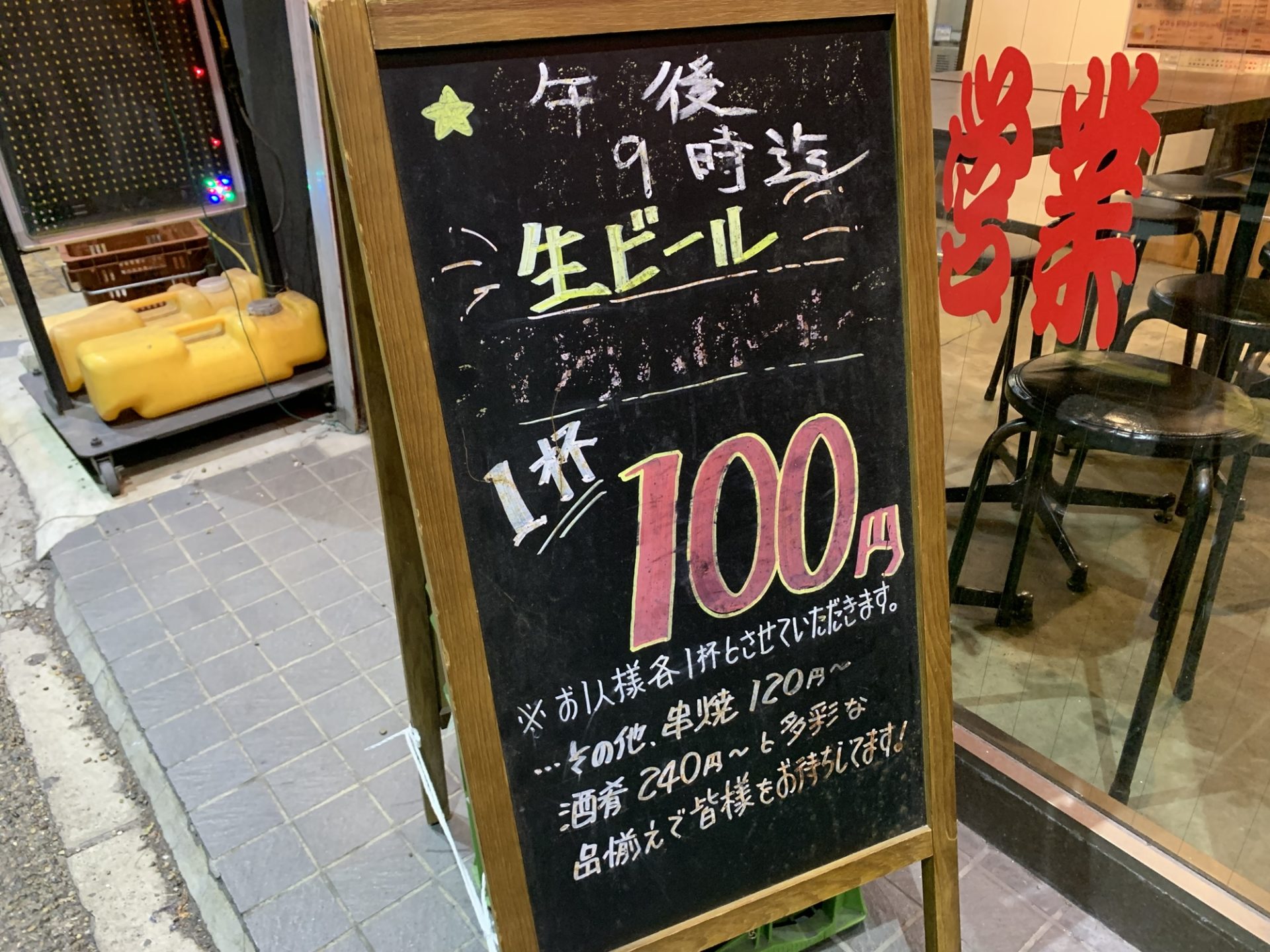 この日は休日の夜、浅草から綾瀬までの散歩の途中で立ち寄った3軒目。店内に入ると、昭和の香り漂う雰囲気と赤提灯の灯りが迎えてくれます。まずは、21時までのサービス価格で提供される生ビールを注文。キンキンに冷えたジョッキに注がれたビールは、喉越しも良く、散歩の疲れを癒してくれます。これで100円とは、まさに下町価格!