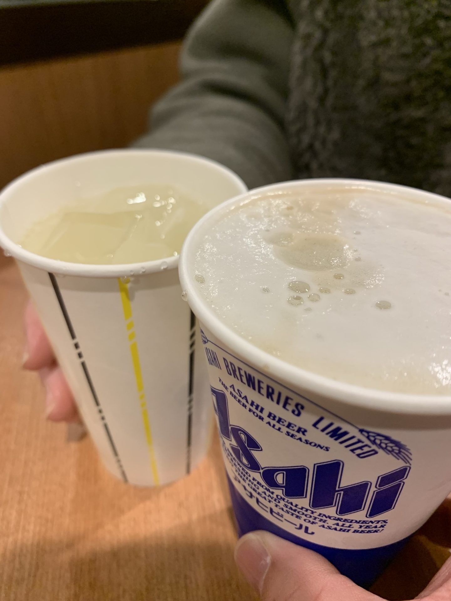 休日の夜に訪れた「味の笛 本店」。まずは生ビールで乾杯!紙コップで提供される生ビールは夏の縁日を連想させます。喉を潤す一杯は格別。泡のきめ細やかさと爽快な喉越しが、疲れた体に染み渡ります。