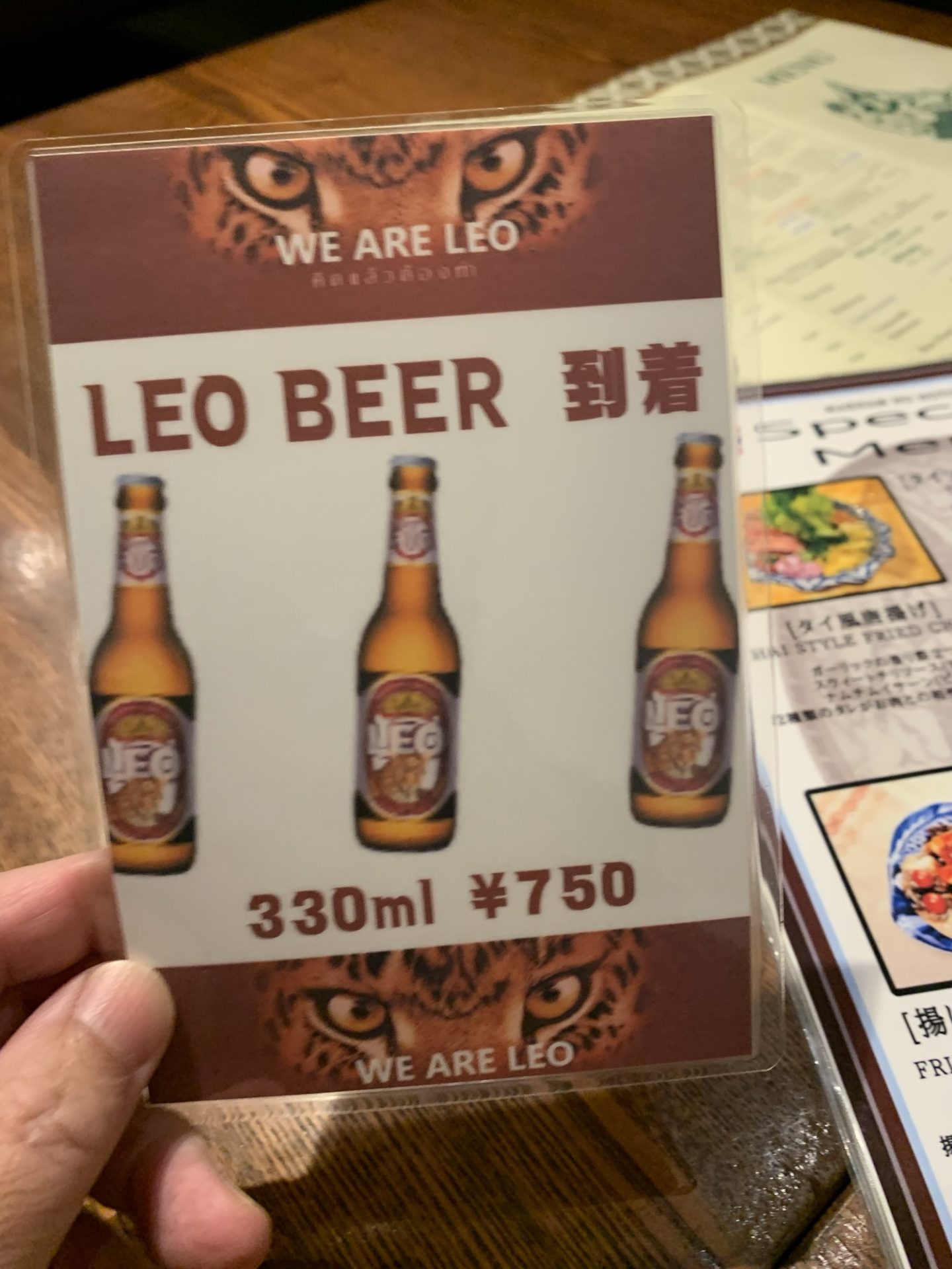 まずはタイの定番ビール「LEO」で乾杯!ホップの苦味は控えめで、すっきりした飲み口がスパイシーな料理によく合う。冷えた瓶ビールのラベルを見ただけで南国気分、ゴクゴクいけちゃう“レオ”様に感謝!