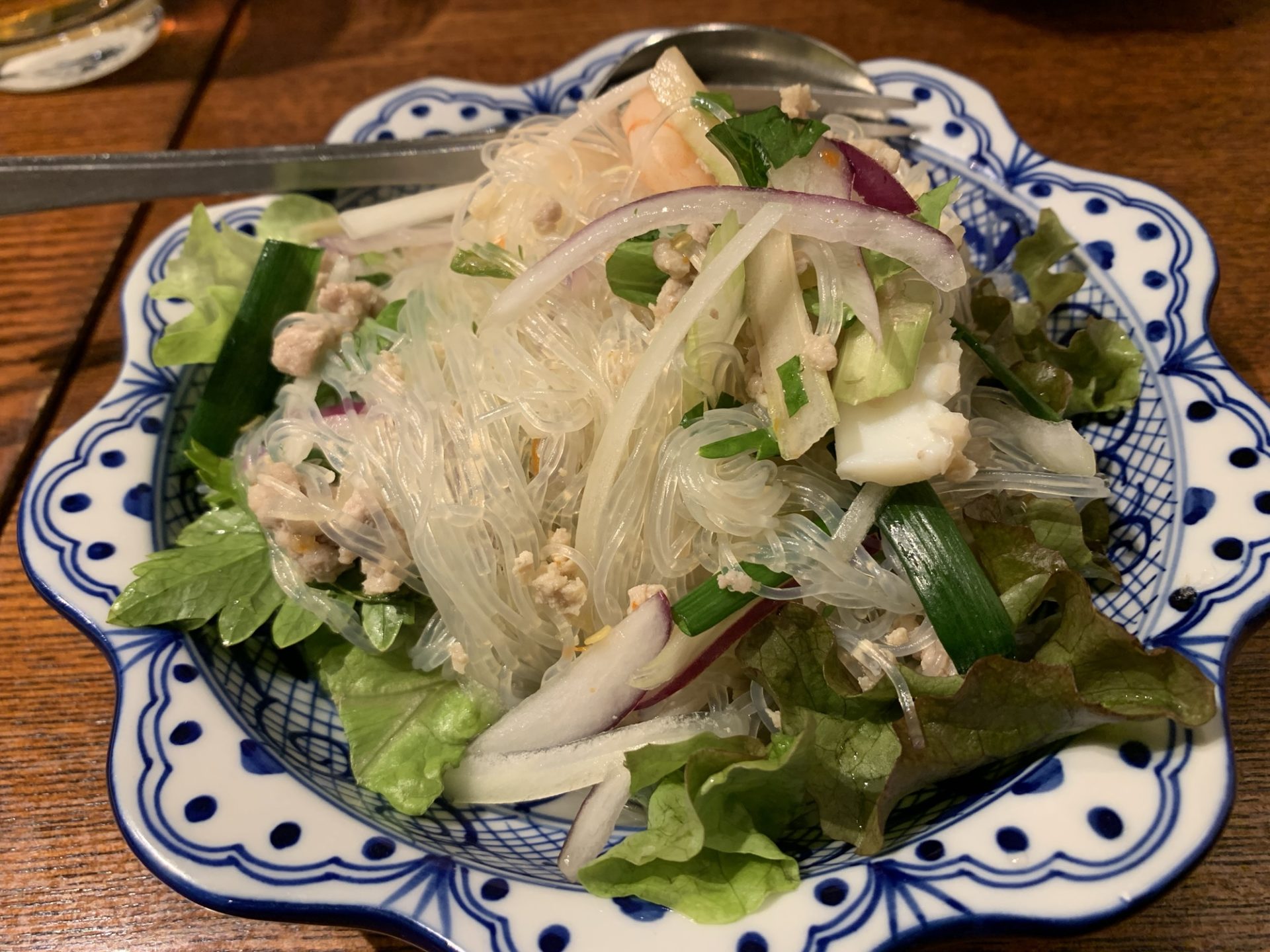 おなじみヤムウンセンは、プリプリの海老とつるっとした春雨、キリッとしたレモンの酸味にピリリとした辛さが追いかけてきて、思わず目が覚める旨さ。