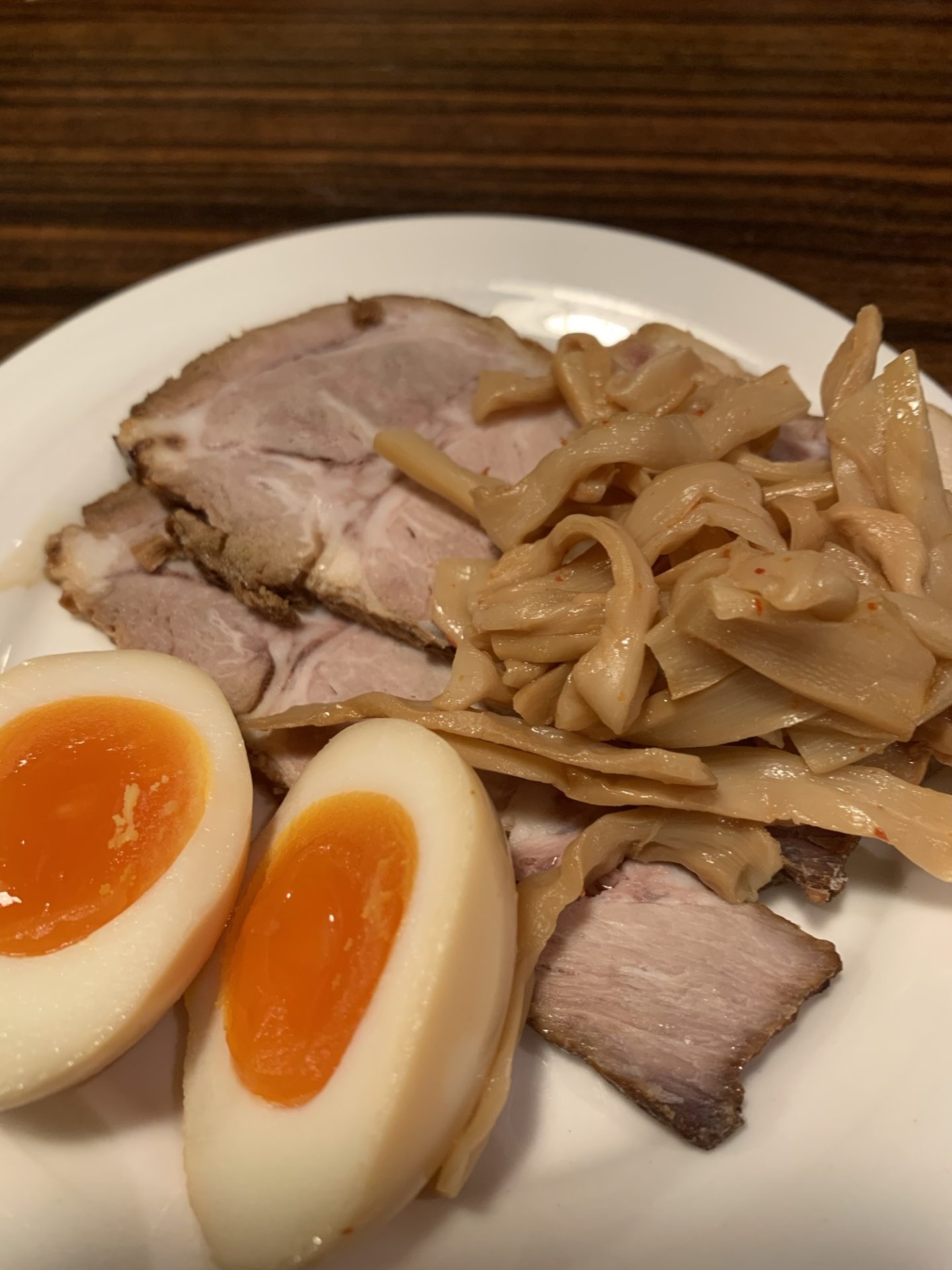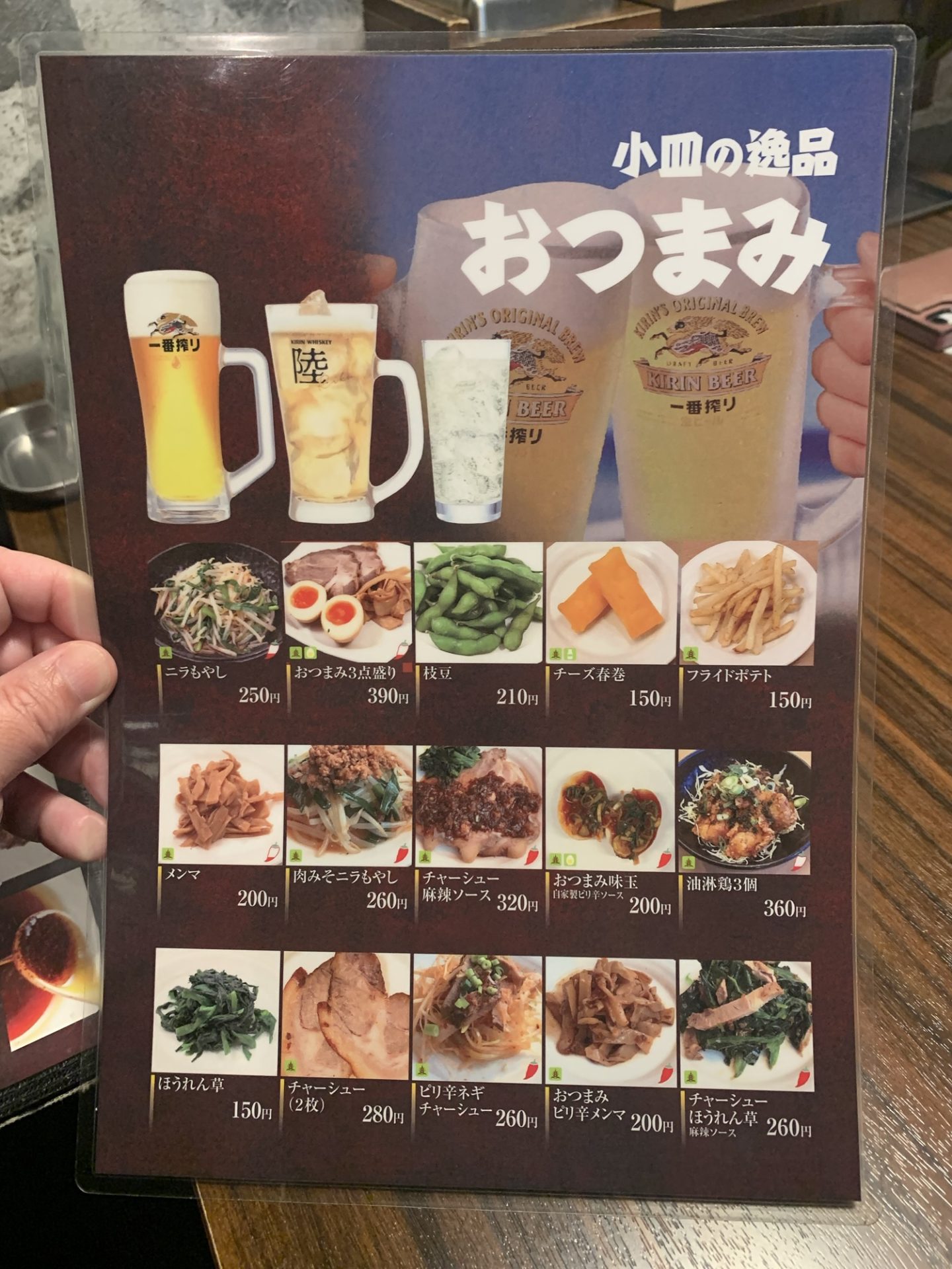 ビールのお供に、おつまみ3点盛りを注文。チャーシュー、メンマ、味玉の組み合わせで、それぞれの味わいがビールと絶妙にマッチ。特にチャーシューは、しっとりとした食感と濃厚な味付けが印象的でした。