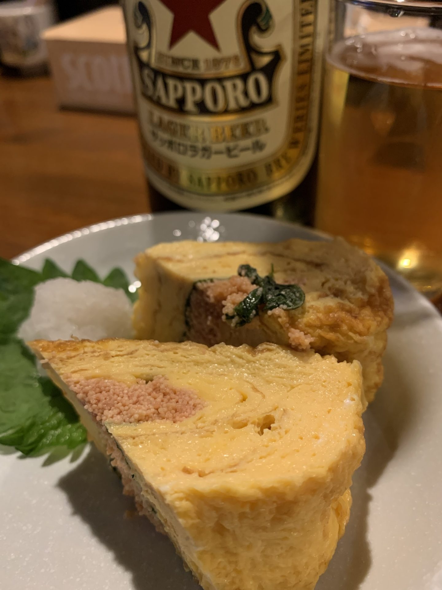 ・ 明太子玉子焼き は「ちょっとしょっぱいかも…」という女将さんの言葉とは裏腹に、ちょうどいい塩加減!明太子のアクセントがたまりません。
