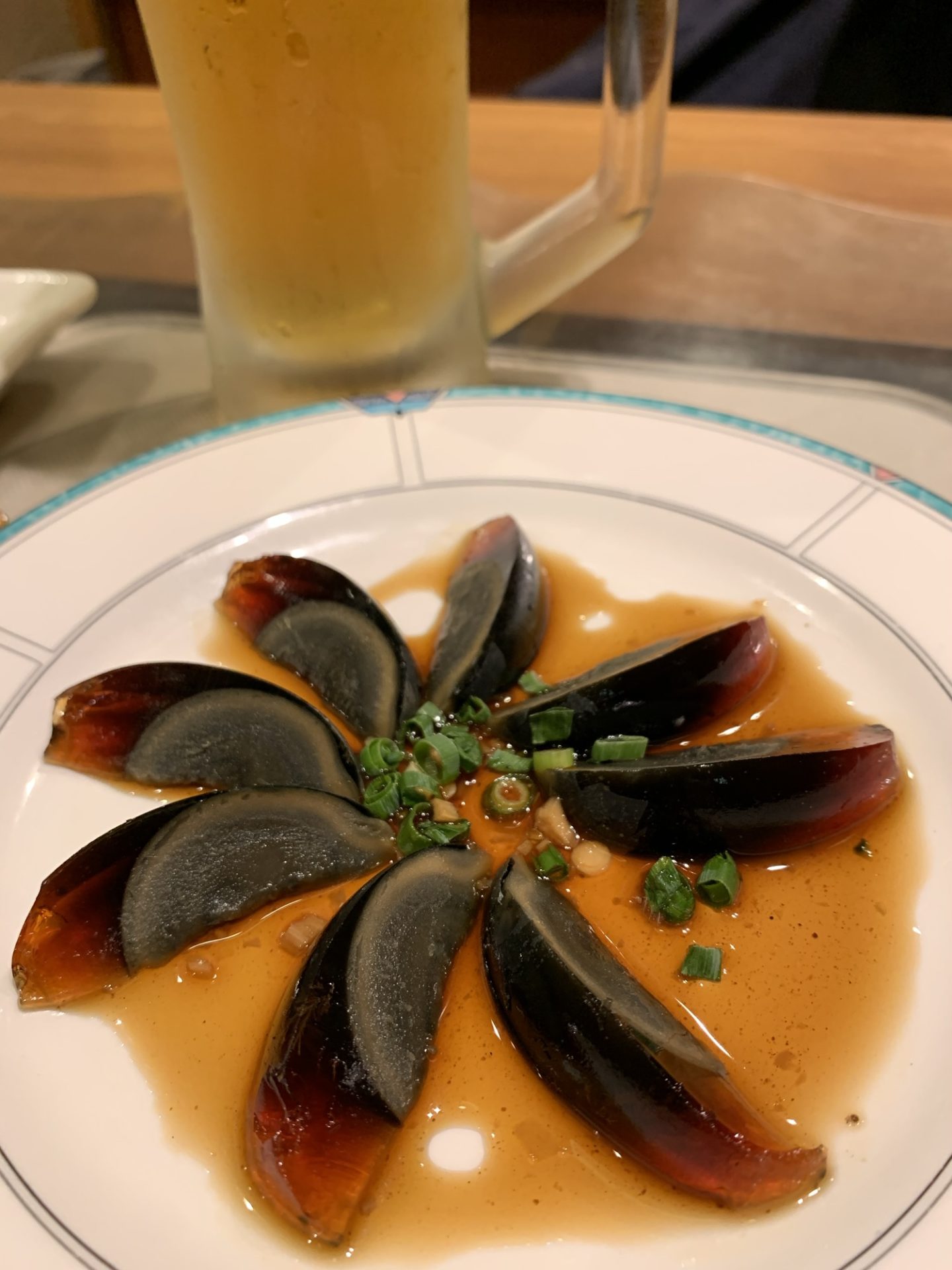 きれいな盛り付けに目が惹かれる一品。クセは控えめで、とろっとした黄身と柔らかな白身が思いのほか上品。香りはまろやかで、日本酒にも合いそう。