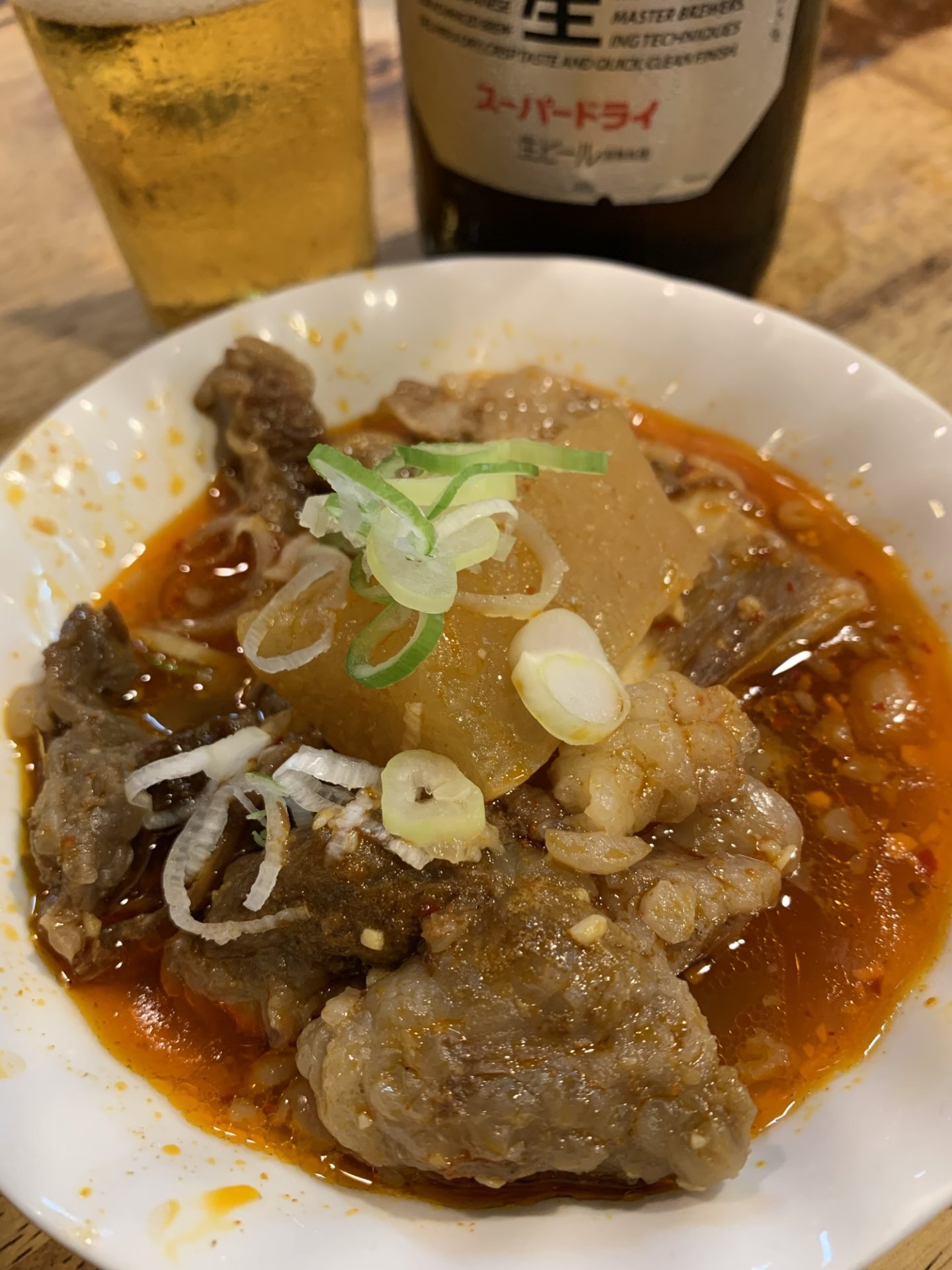 ビールをちびちびやっているうちに頼んだ、名物の牛煮込み。通称「牛ニコ」出てきたのは、小さな器にたっぷり盛られた、肉と根菜、そして深い味わいの煮汁。口に運べば、プルッと柔らかい肉片がホロリ、ピリッとした辛みがビールとよく合う。肉のごろっとした存在感と、濃いめの味付けが、まさに“酒場の煮込み”って感じで、これだけで何杯もビールが進んじゃう。