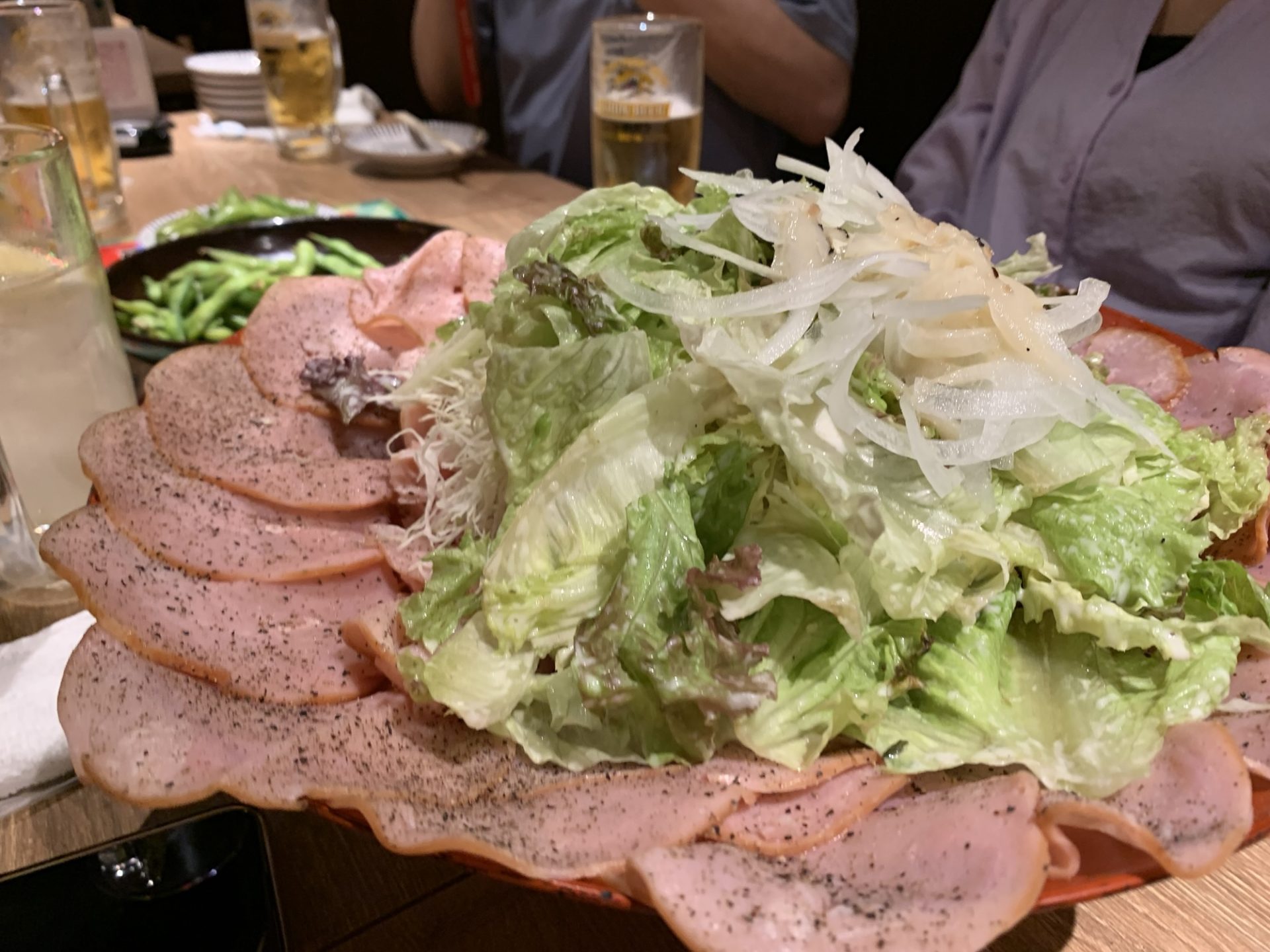 続いて軽めのスタートとしてハムサラダ。薄切りハムがたっぷり敷かれ、レタスやスライスオニオンが彩りを添えます。ハムの塩気と野菜のシャキッとした食感がバランスよく、ビールとも相性良し。コースの出だしとして、これで場が落ち着きました。