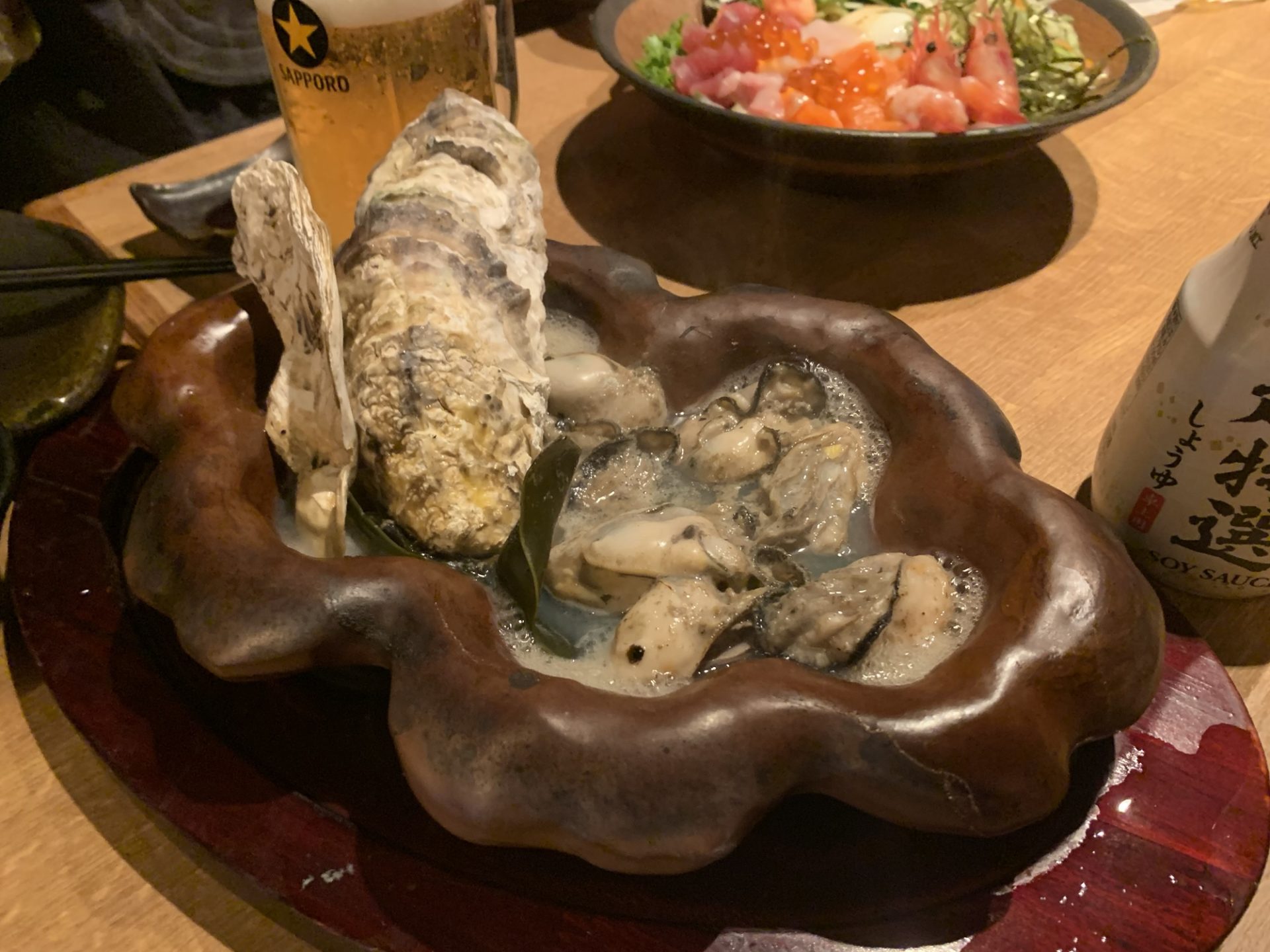 次に出されたカキの昆布煮。大粒の牡蠣がぷりっとしていて、昆布出汁&酒蒸しの仕立てが絶妙。熱々の器でやってきて、スープまで飲み干したくなる味わいでした。魚介居酒屋らしい一皿で、思わず「お替わりしたい!」と思うほど魅力的です。