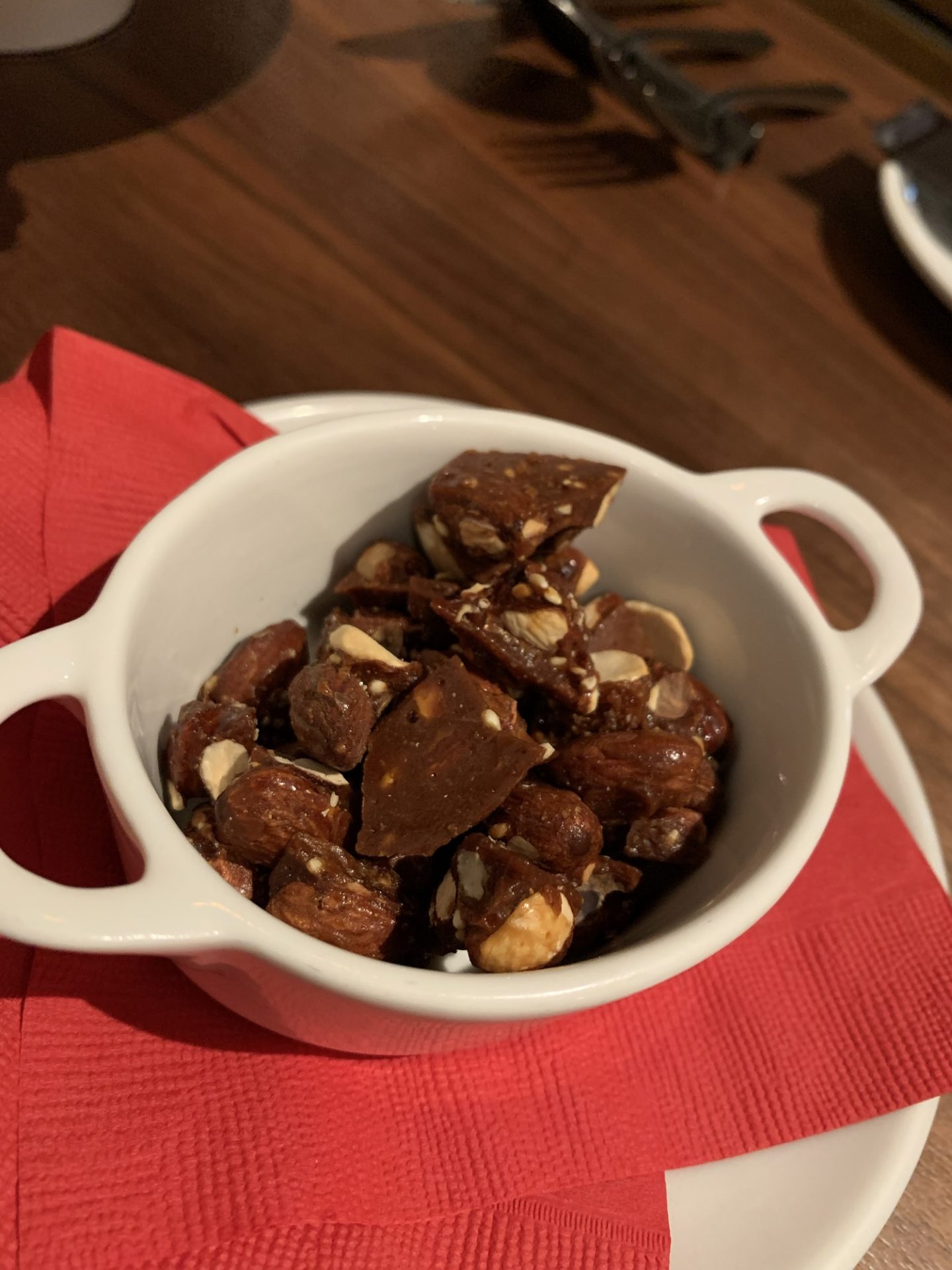 一見シンプルだけど、キャラメリゼされたアーモンドは香ばしさと甘さが絶妙。ちょっとした口休めとして、ワインの合間にポリポリつまみたくなる、かわいいサイドです。