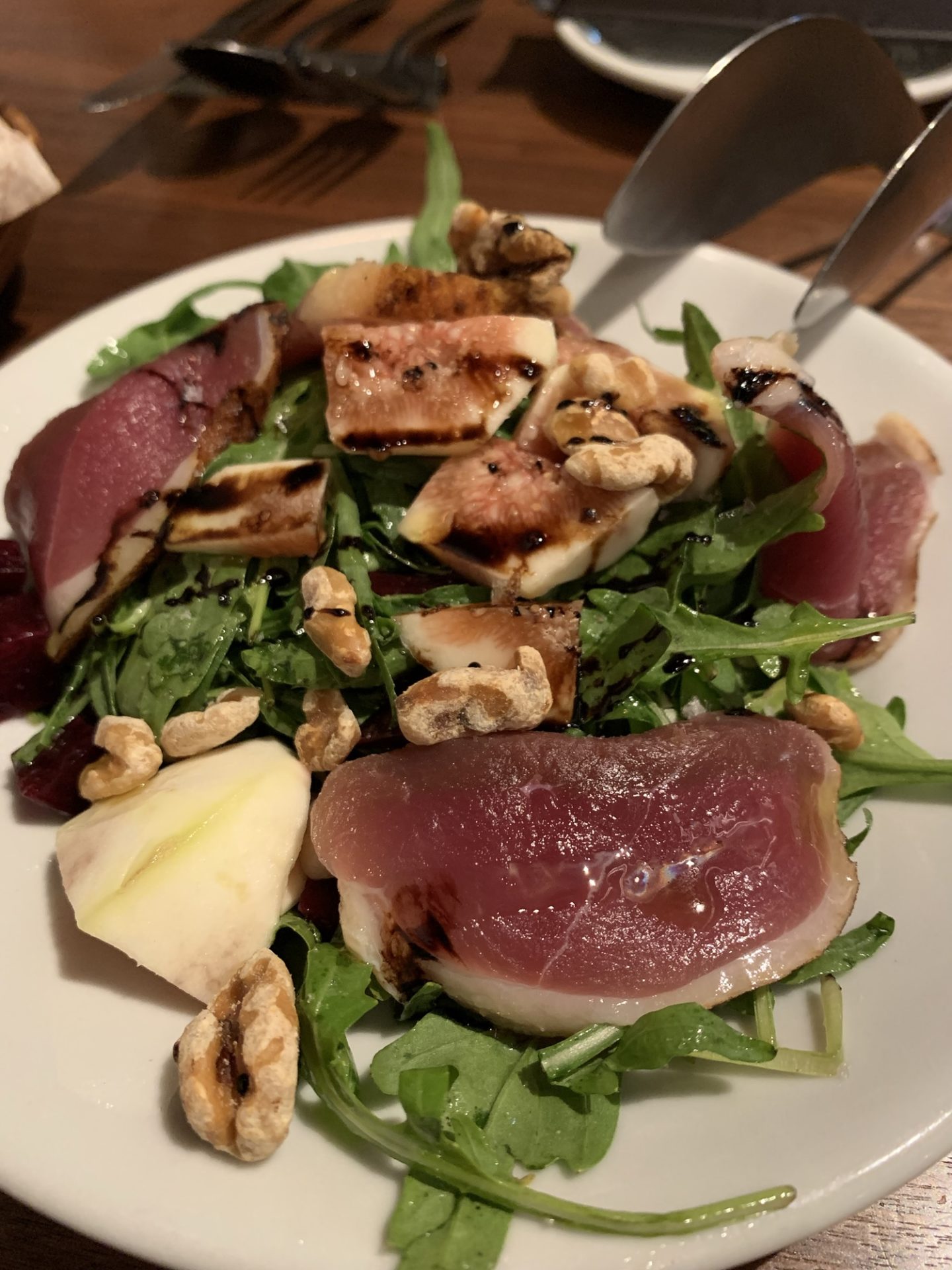 合鴨のしっとりしたハムと、甘みが強いイチヂクがサラダで共演。葉野菜のシャキシャキ感とドレッシングの酸味がアクセントになっていて、ワインが進みます。バランス良くて、箸(フォーク)が止まらない一品。