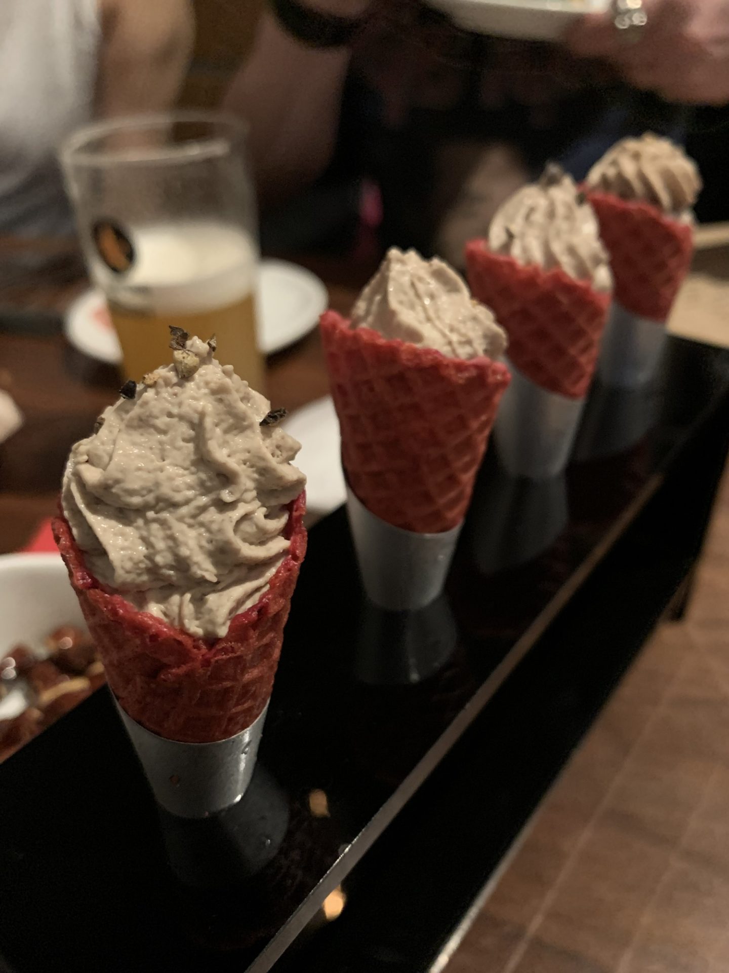 見た目はコーンみたいに可愛い。レバームースはクリーミーで、レバー特有のコクがしっとりと舌に残る一方で臭みは抑えられていて、パンやクラッカーにのせて食べても、ワインをひと口ついでも満足度が高い。