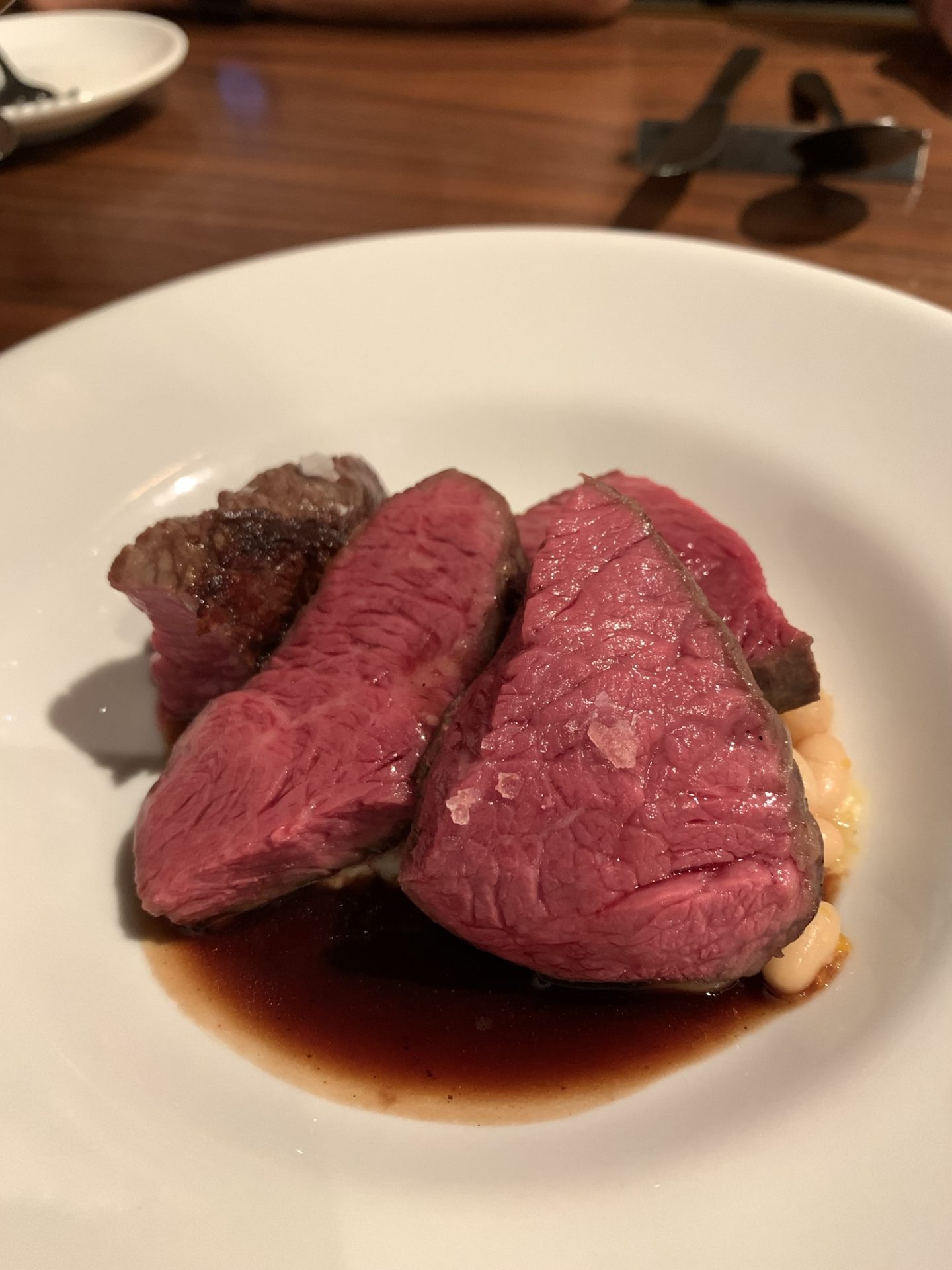 メインには肉料理を。和牛のランイチ(肩から腰にかけての部位)は旨みも脂も程よく、丁寧に焼かれていて噛むたびに肉の深い甘みが広がります。ワインとも相性抜群で、友人とシェアして楽しむのにぴったり。