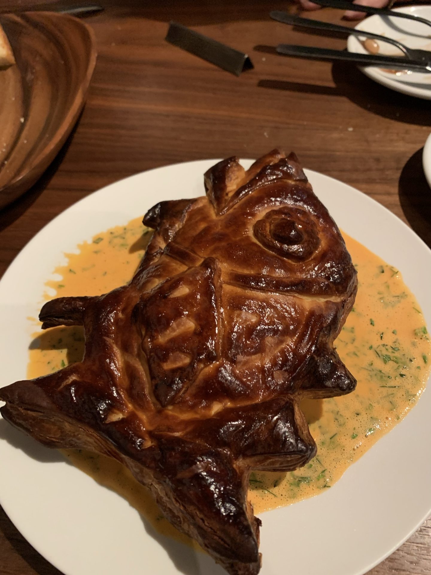 見た目にも楽しいパイ包み。中に詰められた真鯛はふっくらとしていて、パイの香ばしさとバターの風味が加わって、重すぎず上品なメイン料理に。これがこのビストロの実力を感じる一皿です。
