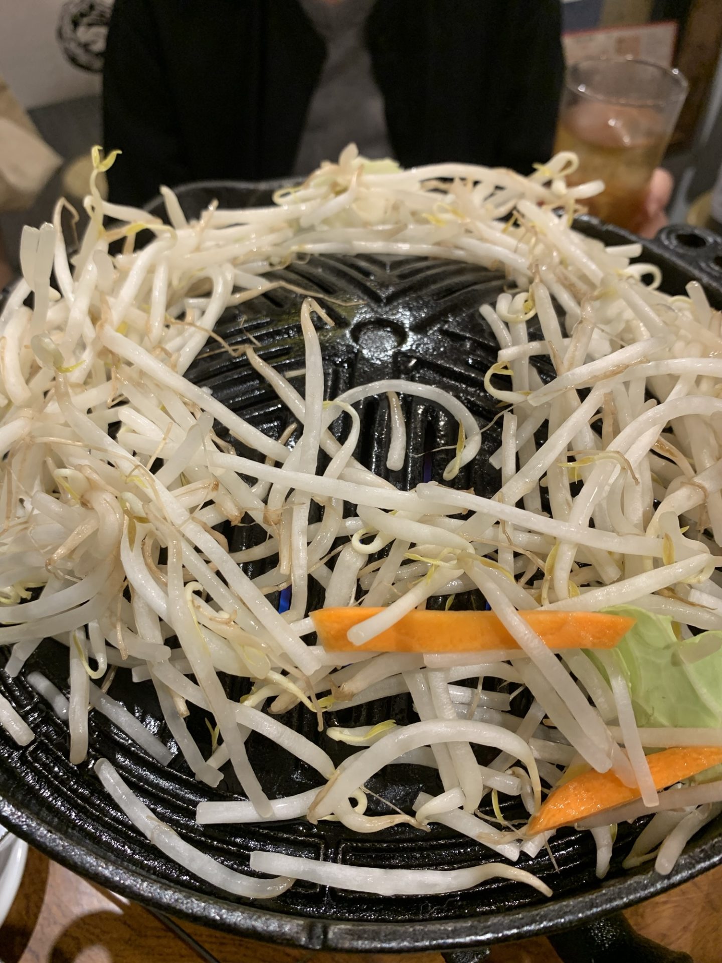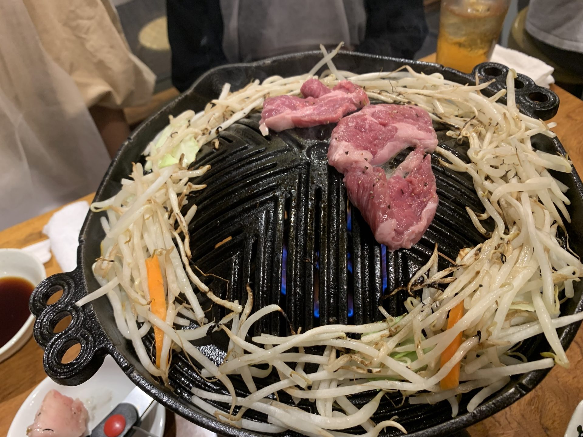 ラムを焼きながら、一緒に添えられた野菜盛り合わせ。もやしやキャベツなどが鍋のふちにあふれんばかりに盛られていて、おかわり自由なのはかなりコスパ高めです。野菜のシャキシャキ感が、肉の脂をいい感じに中和してくれます。