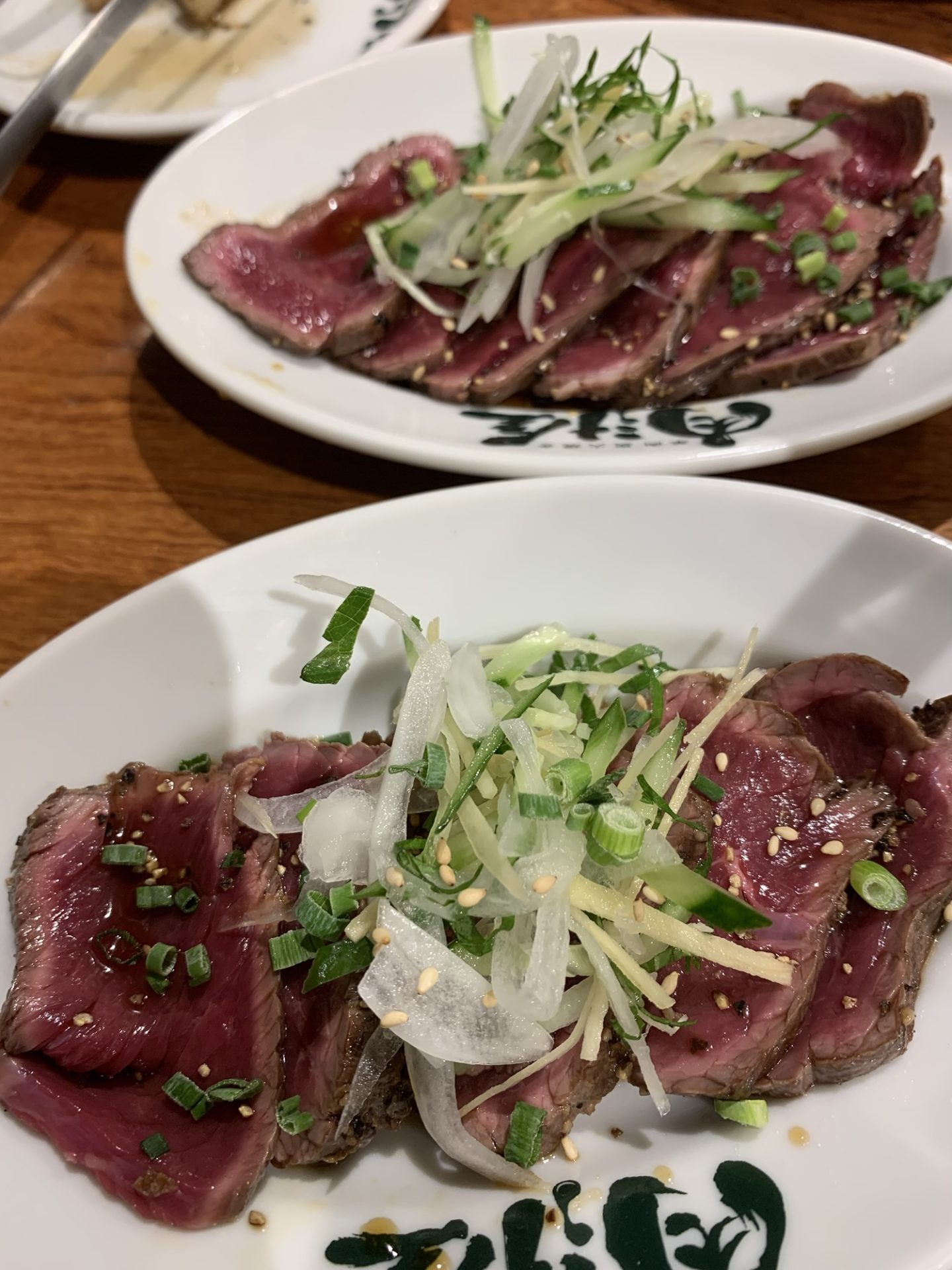 生ラムたたきはポン酢が効いていて、さっぱり感とラムの風味が見事にマッチ。肉質はしっとりとしていて、軽くレア気味。噛むたびにラムの旨味と甘みがじんわりと広がって、飲みものが進む一品です。