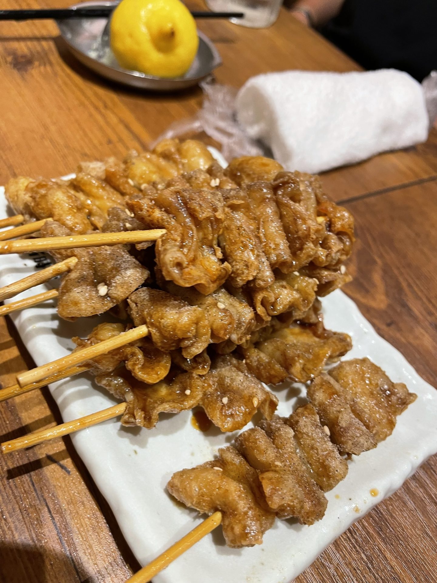 そして名物の「伝串(普通の串焼きの鶏皮串)」を一本。たった50円で、皮はカリッと、噛むごとに鶏の脂と塩気がじゅわっと広がる——バツグンのコスパと味。二軒目なのに、「もう一本!」とついつい手が伸びる。