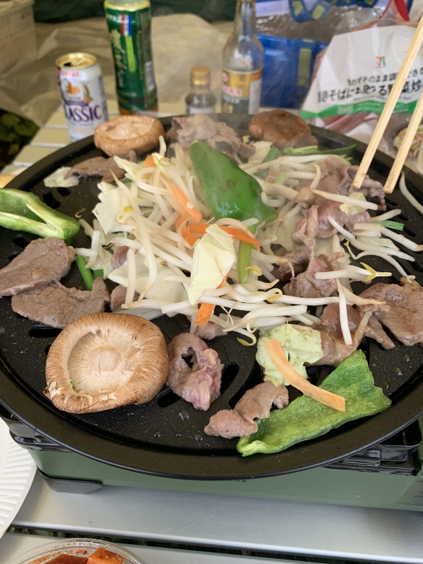 そして一発目のつまみはジンギスカン。イワタニの焼肉プレートで肉を焼きます。牧草地の草の香りと、ほんのり冷えた風が切り替わる中で、熱々の肉を頬張る。ラムの脂がじゅわっと広がり、煙とともに広がる香ばしさに、キャンプ感が一気に高まる。ビール片手に、自然の中で食べるジンギスカンは、まさに格別。