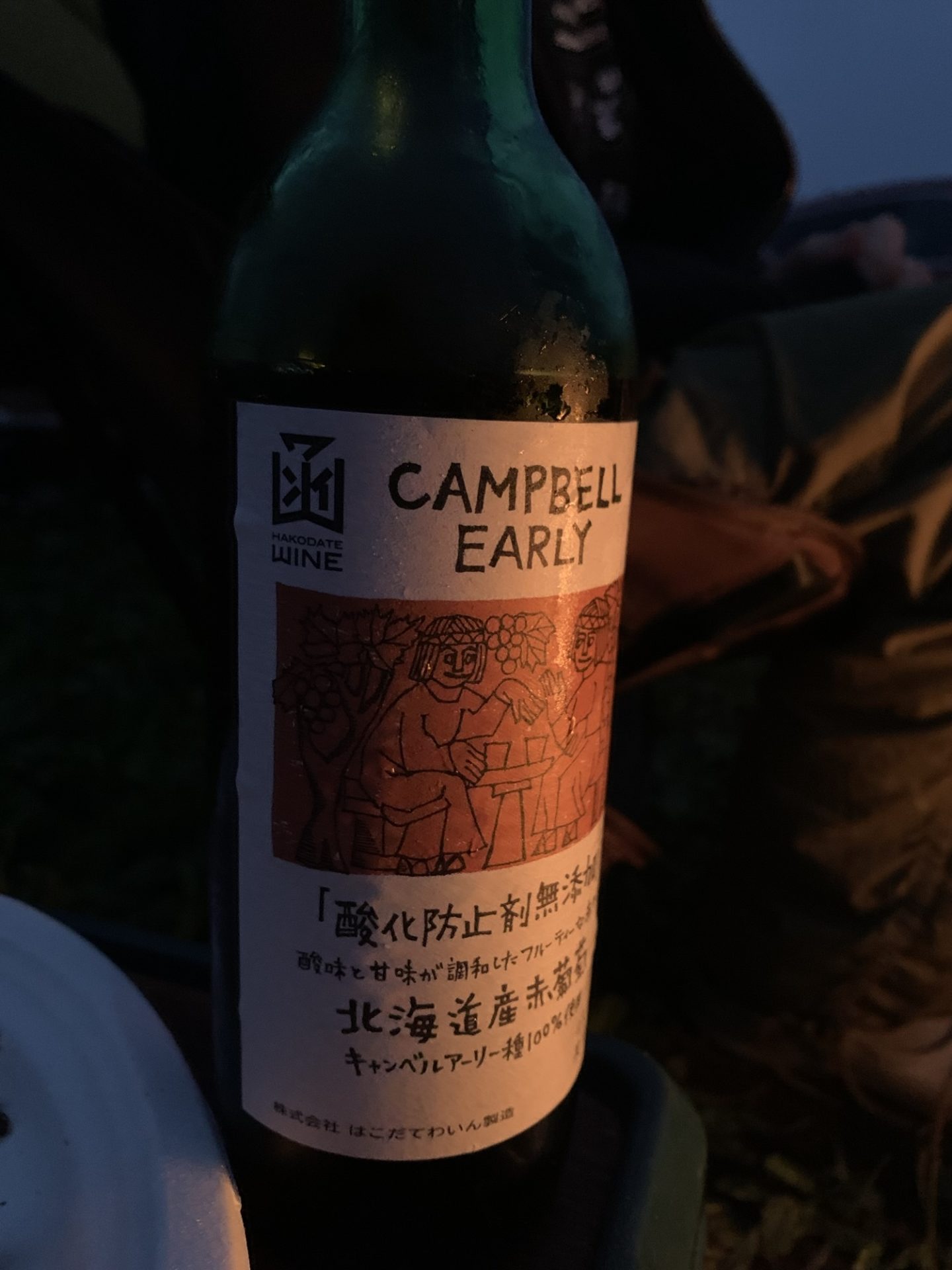 夜が近づき、夕焼けで空が茜から藍へと移り変わる頃、次は赤ワインに手を伸ばす。キャンベルアーリーの穏やかな酸味と果実感が、ジンギスカンの濃い味と意外と相性よし。ワインを傾けながら語らううちに、辺りは次第に星が瞬き始める。焚き火のオレンジに照らされたテントと、大自然の闇──まさに“大人のキャンプ時間”。
