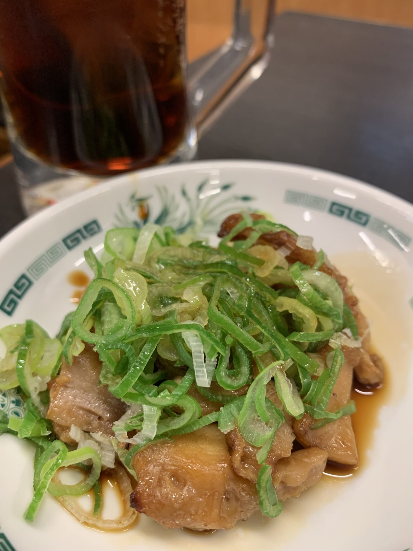 甘辛いタレを纏った鶏肉に、山盛りのネギ。このネギのシャキシャキ感がたまらない。タレの脂をネギがさっぱりと流し、そこにすかさず酒を流し込む。もはや、この円卓(テーブル)の上には幸せしか存在しない。