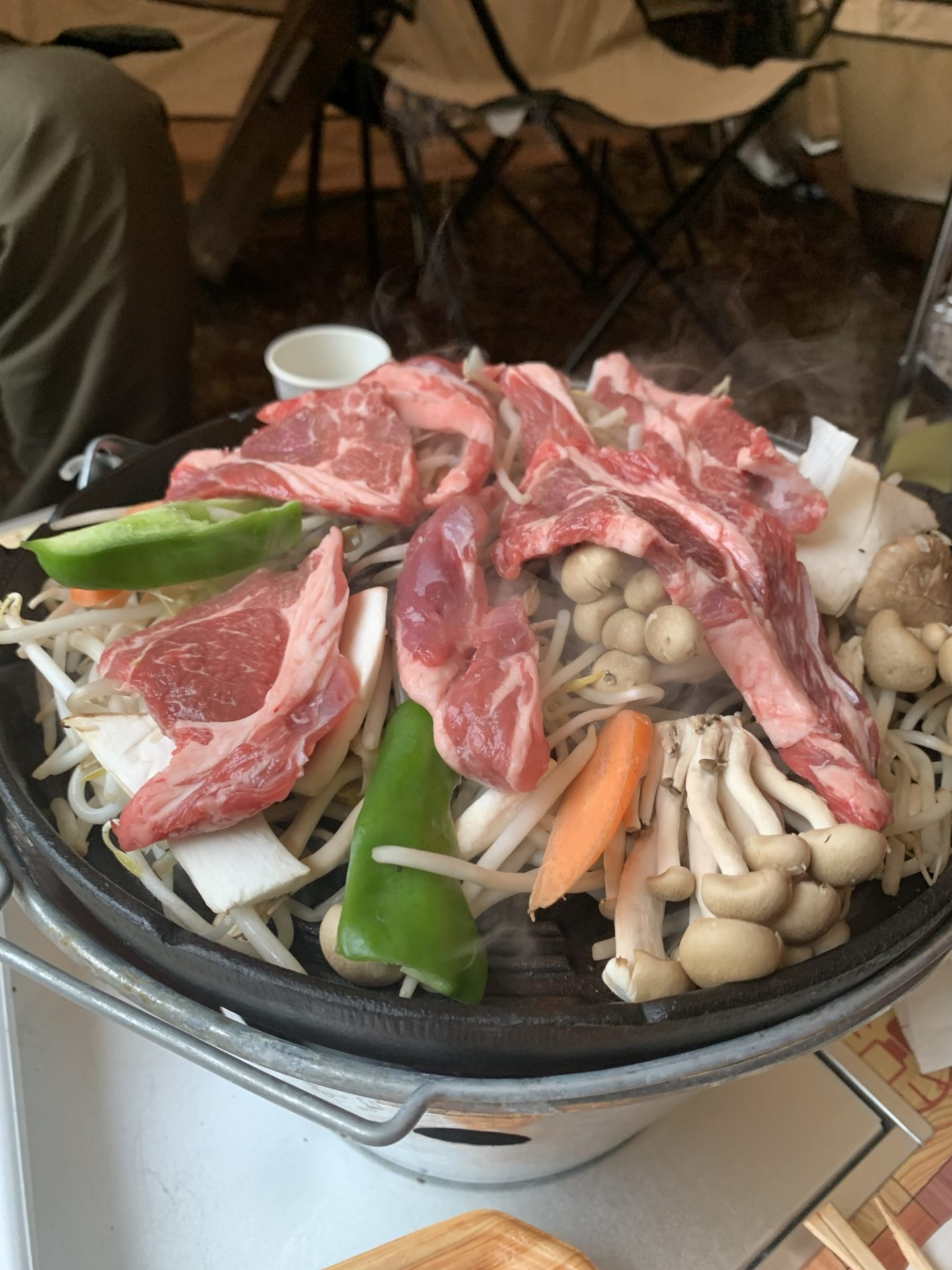 朝っぱらから鉄板で焼かれる羊肉。ジューッ!という威勢のいい音とともに立ち込める香ばしい匂い。朝から肉を喰らうこの背徳感、これぞキャンプベアードの醍醐味である。
